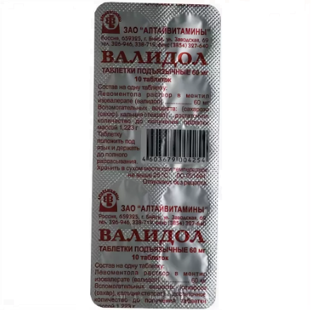 Активное вещество: левоментола раствор в ментил изовалерате (валидол) - 60 мг.