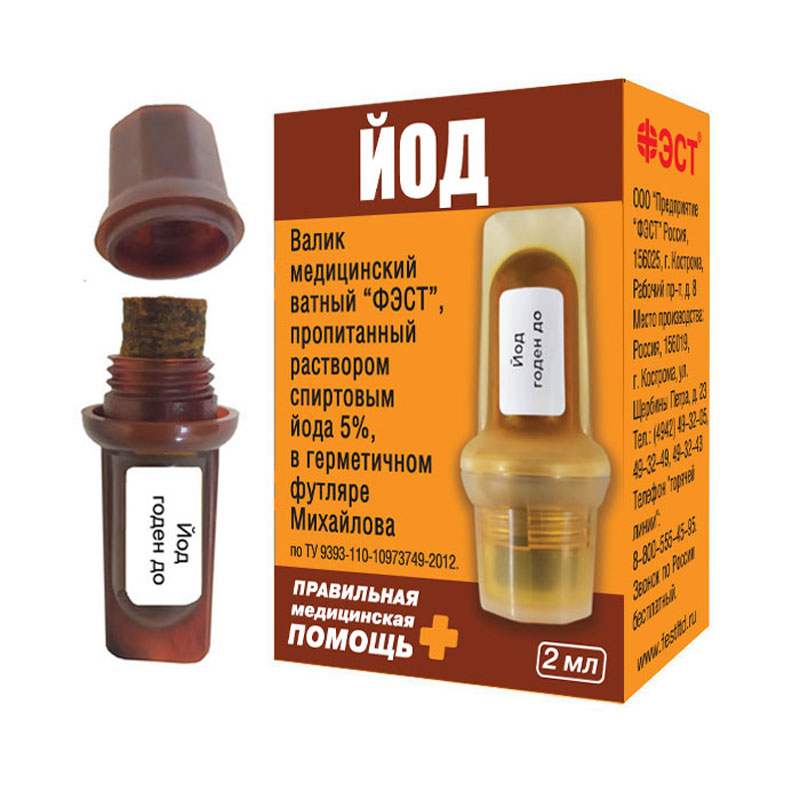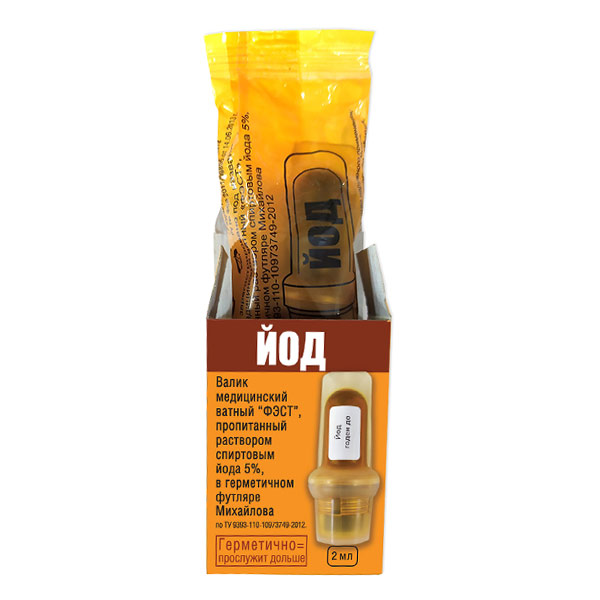 Валик медицинский ватный ФЭСТ, пропитанный раствором спиртовым йода 5%, в герметичном футляре Михайлова по ТУ 9393-110-10973749-2012. Привычные лекарственные средства в компактных и удобных герметичных футлярах Михайлова! Незаменимы в быту, дороге, походе, на даче, рыбалке, прогулке! Рациональная причина покупки: герметично = прослужит дольше.