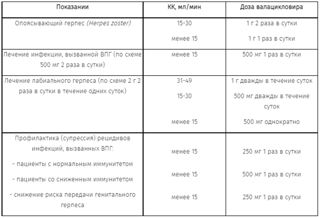 У пациентов с хронической почечной недостаточностью рекомендуется часто определять КК, особенно в период, когда функция почек быстро меняется (в частности, сразу после трансплантации или приживления трансплантата), при этом доза валацикловира корректируется в соответствии с показателями КК.