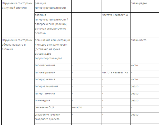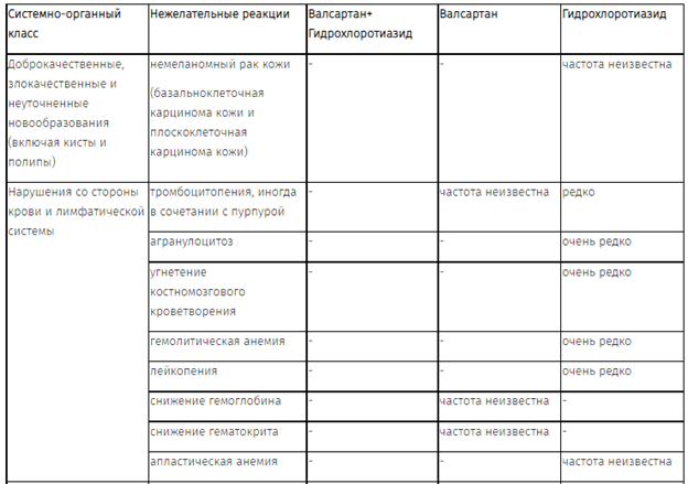 Нежелательные реакции (HP) по данным клинических и постмаркетинговых исследований встречались чаще при применении валсартана и гидрохлоротиазида в сравнении с плацебо.