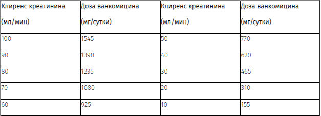 При анурии данную таблицу нельзя применять для определения дозы препарата. При анурии начальная доза - 15 мг/кг для быстрого создания терапевтических концентраций ванкомицина в сыворотке, для стабильной концентрации препарата поддерживающая доза - 1,9 мг/кг/сутки.