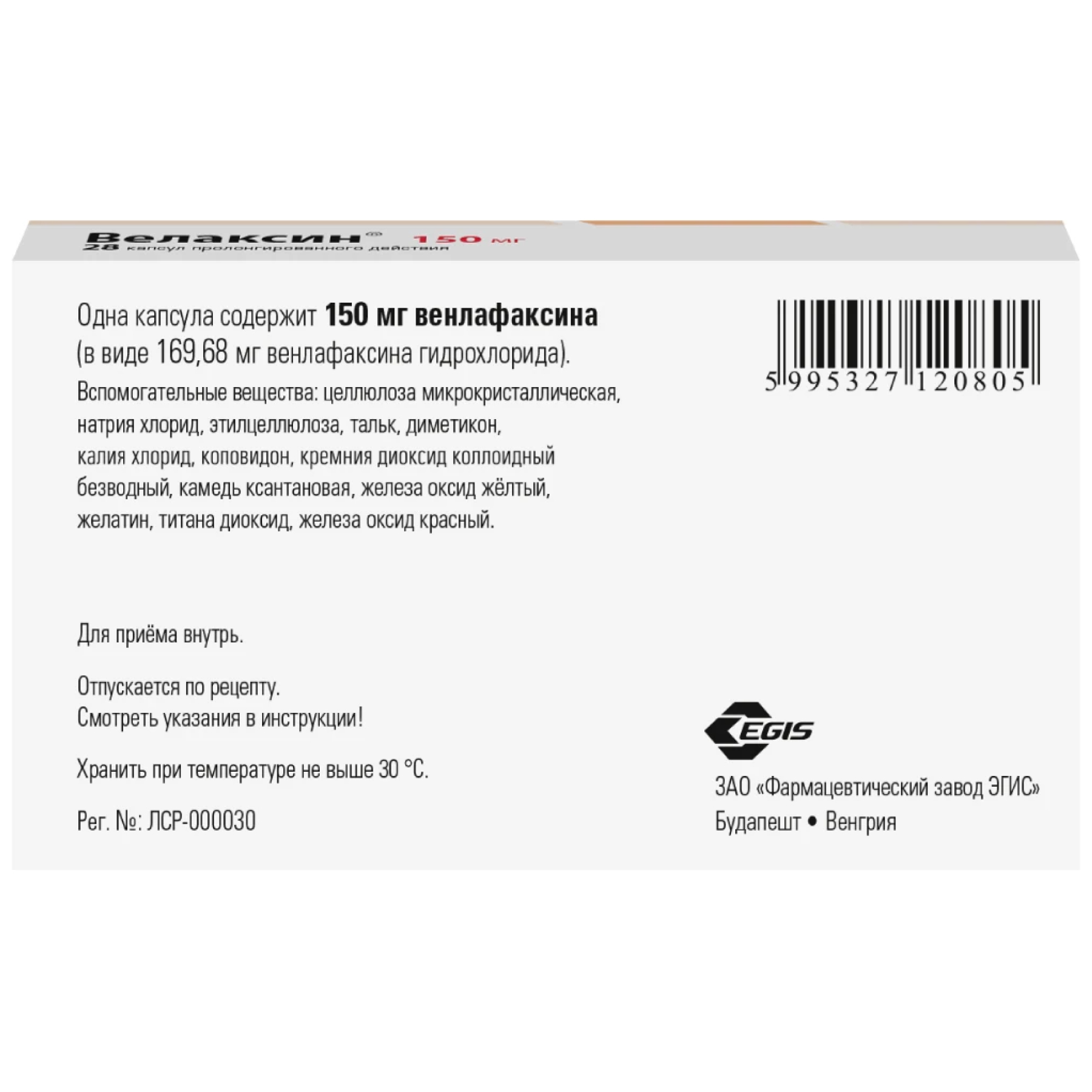 После приема внутрь Cmax венлафаксина и ОДВ (основной метаболит) в плазме крови достигаются в течение 6.0±1.5 и 8.8±2.2 ч, соответственно. Скорость всасывания венлафаксина из капсул пролонгированного действия ниже скорости его элиминации. Поэтому T1/2 венлафаксина после назначения капсул пролонгированного действия (15±6 ч) представляет собой фактически T1/2 всасывания, нежели T1/2 распределения (5±2 ч), который отмечается после назначения препарата в форме таблеток.
