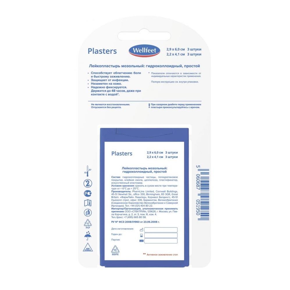 Инструкция по применению Wellfeet 6 шт пластырь гидроколлоидный от влажных мозолей 2-х размеров в пластиковом футляре