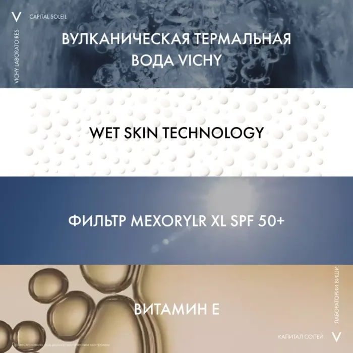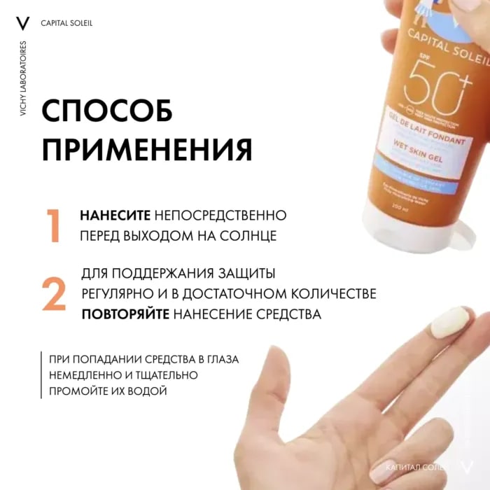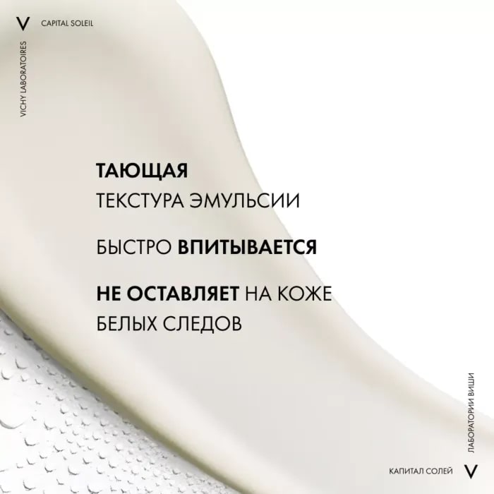 Интенсивность защиты от солнца сохраняется даже при нанесении на влажную кожу. Тающая текстура эмульсии быстро впитывается, не оставляя на коже белых следов.