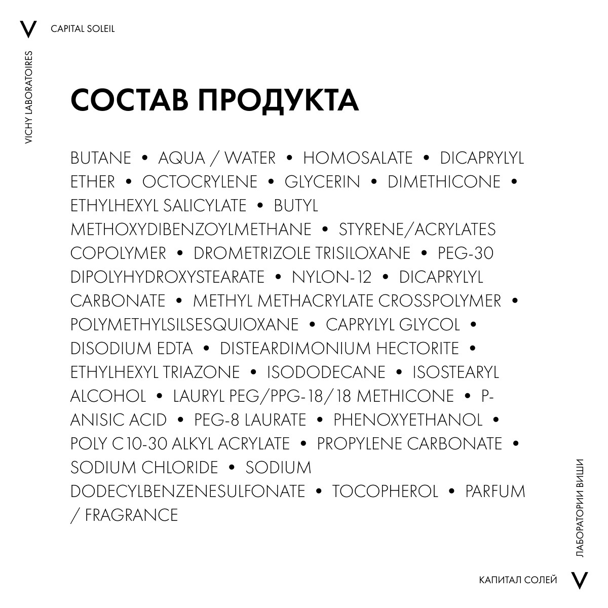Vichy Ideal Soleil Brume hydratante invisible SPF 50 – легкий спрей без спирта, который подходит даже для очень чувствительной кожи. Он окутывает тело легкой освежающей вуалью, моментально устраняет дискомфорт от сухости, стянутости и раздражения. Запатентованные водо- и фотоустойчивые фильтры Mexoryl XL и Parsol надолго обеспечивают высокую степень защиты от UVА- и UVB-лучей. Виши Капитал Идеал Солей Спрей-вуаль увлажняющий SPF50 разглаживает и смягчает кожу, восстанавливает ее здоровое сияние, замедляет возрастное старение. Быстро впитывается, не оставляет белого налета, липкой пленки, жирного блеска. Отвечает европейским требованиям к солнцезащитной косметике.