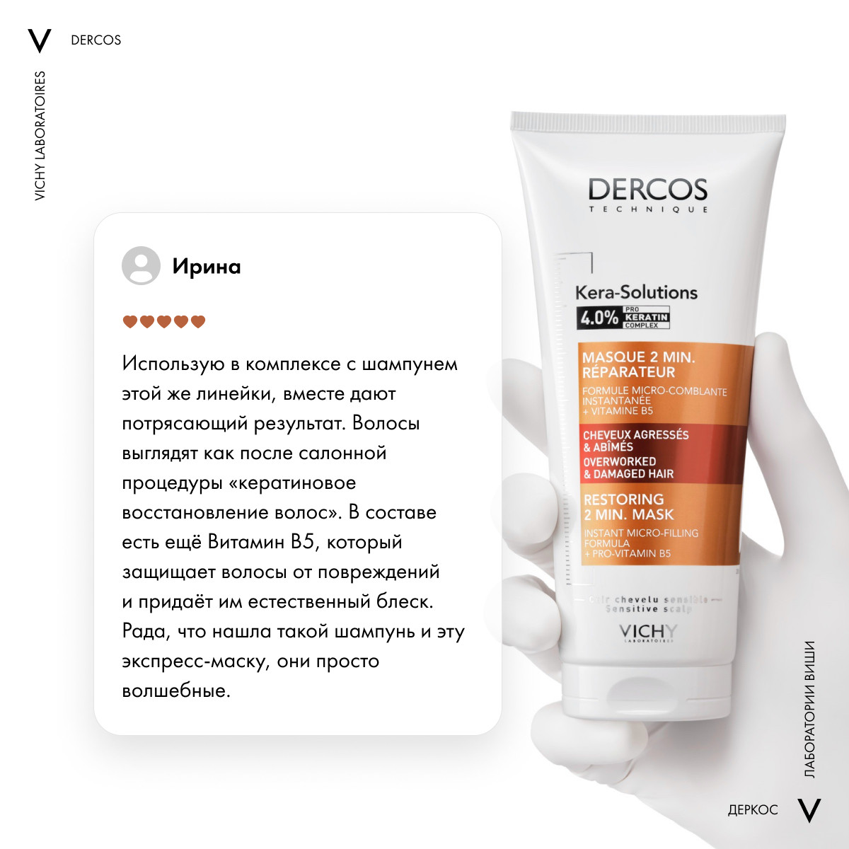 Vichy Dercos Kera-Solutions Restoring Mask разработана для восстановления и защиты ослабленных, поврежденных волос. Специальная формула, содержащая кератин и витамин В5, разглаживает волосы, питает их, делает эластичными, увлажняет,