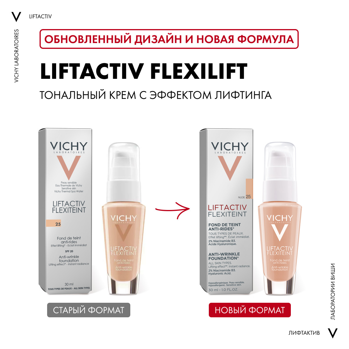 Vichy Liftactiv Flexilift 25 – тональный крем и ухаживающее средство, способно замаскировать возрастные изменения кожи и одновременно бороться с признаками старения. Крем равномерно распределяется и обеспечивает плотное покрытие без эффекта «маски». Ухаживающие компоненты эффективно устраняют признаки старения, повышают плотность кожи, уменьшают глубину морщин, подтягивают. Крем сохраняет стойкий макияж в течение 8 часов. Податливая текстура легко распределяется и не скапливается в морщинках. Ваша кожа сияет свежестью и выглядит моложе .