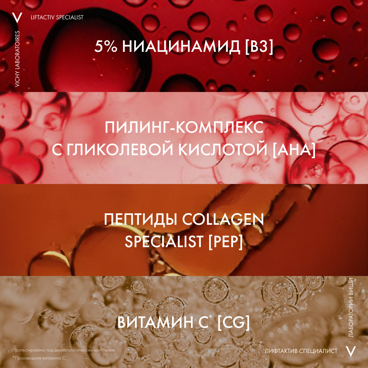 Гипоаллергенная формула Vichy Liftactiv Speciallist B3 serum обогащена вулканической водой Vichy и ингредиентами в эффективной концентарции: 5% ниацинамид, гликолевая кислота, витамин C и биопептиды - в комплексе заметно сокращает видимость пигментных пятен, предотвращает их повторное появление, сокращает морщины. Выравнивает тон и придает сияние, а также подходит для всех фототипов кожи.