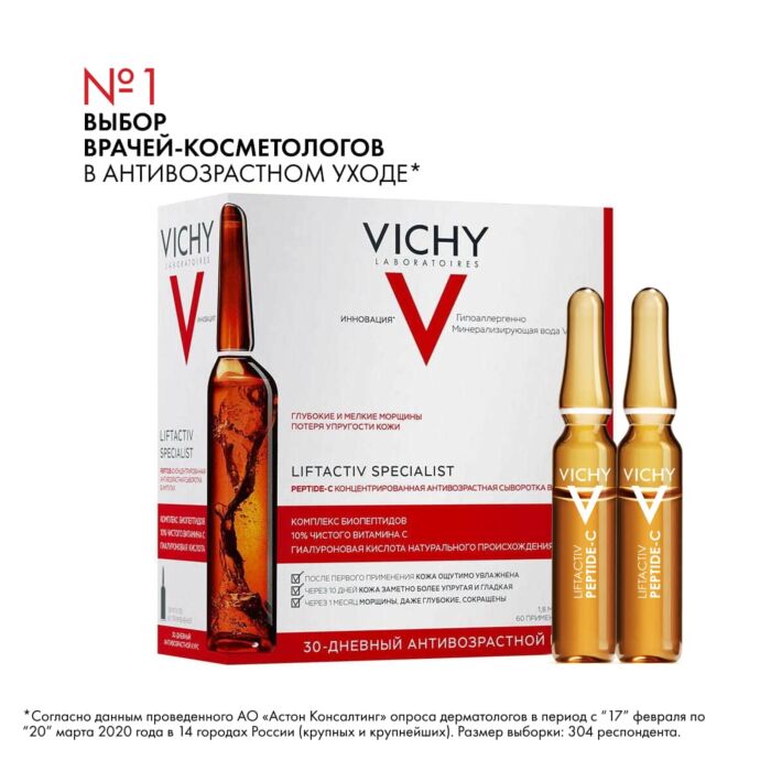 Омолаживающий уход Vichy Liftactiv Specialist Peptide-C ampoules anti-age начинает активно работать с первого применения: мгновенно возвращает комфорт, повышает упругость кожи уже на 10 день применения и через 1 месяц заметно сокращает даже глубокие морщины. В формуле сыворотки Виши Лифтактив Специалист Пептид-С присутствуют активные био-пептиды, которые отвечают за синтез коллагена, так необходимого для упругости и плотности кожи. Также в составе представлен известный антиоксидант - витамин С - в высокой концентрации 10%. Лёгкая текстура сыворотки способствует глубокому проникновению действующих веществ. Средство выпускается в ампулах из тёмного стекла, что позволяет защитить компоненты от воздействия внешних агрессий и сохранить первозданную эффективность формулы. По данным клинических испытаний, проходивших с участием 47 добровольцев, применявших сыворотку 28 дней: