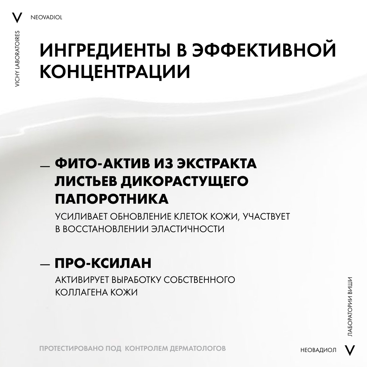 Учитывая специфические изменения кожи в период менопаузы, технологи компании Виши разработали инновационный омолаживающий крем с компенсирующим эффектом. Благодаря усиленной порции про-ксилана и гиалуроновой кислоты, Vichy Neovadiol Phytosculpt Neck and Face Contours подтягивает кожу, обновляет ее, придает эластичность кожным покровам, выравнивает их структуру. При регулярном использовании Виши Неовадиол Фитоскульпт кожа в области шеи преображается, значительно сокращаются морщинки в зоне декольте, подтягивается овал лица. Согласно результатам исследований, эффект заметен уже через 4 часа, а именно: