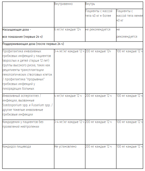 Если пациент не переносит препарат в высокой дозе (то есть 300 мг внутрь каждые 12 ч), то поддерживающую дозу для приема внутрь постепенно снижают с шагом 50 мг до 200 мг каждые 12 ч (для пациентов с массой тела менее 40 кг - до 100 мг каждые 12 ч). Длительность лечения должна быть как можно короче в зависимости от клинического эффекта и результатов микологического исследования. Длительность лечения не должна превышать 180 дней.