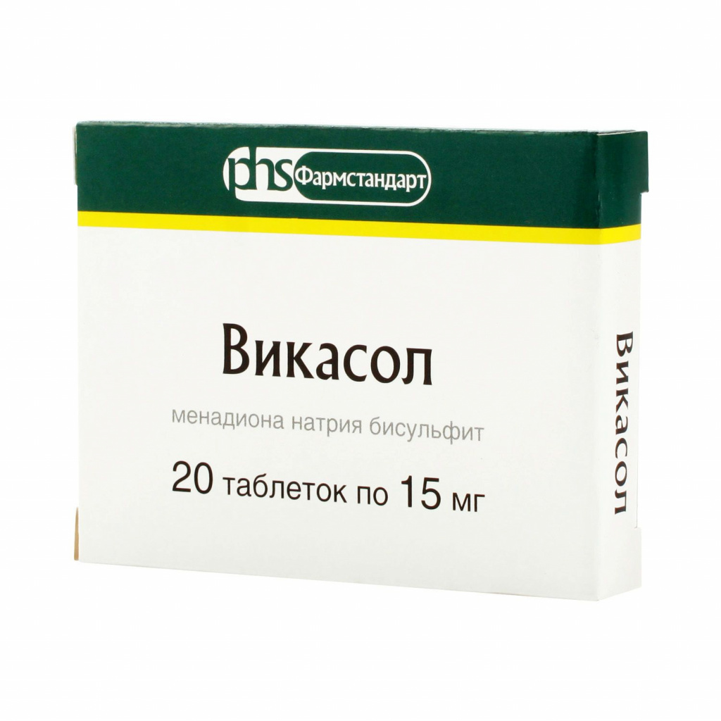 Активное вещество: менадиона натрия бисульфит (викасол) (в пересчете на 100 % вещество) - 15 мг.