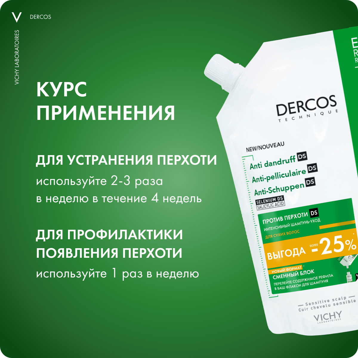 Vichy dercos technique интенсивный шампунь-уход против перхоти ds для нормальных и жирных волос сменный блок