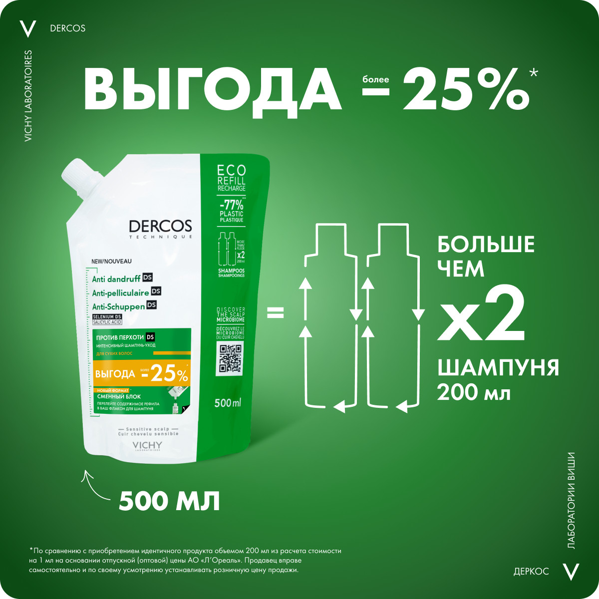 Vichy Dercos DS 500 мл шампунь-уход против перхоти интенсивный для сухих волос Eco-Refill сменный блок