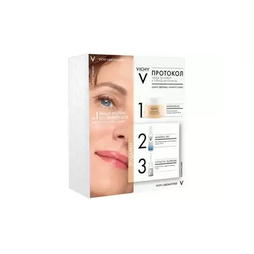 Состав набора: 1) Neovadiol Дневной крем-уход для нормальной и комбинированной кожи в период менопаузы, 50 мл 2) Minéral 89 Ежедневный гель-сыворотка для кожи, подверженной агрессивным внешним воздействиям, 10 мл 3) Liftactiv Supreme Гиалуроновая сыворотка-филлер пролонгированного действия, 10 мл