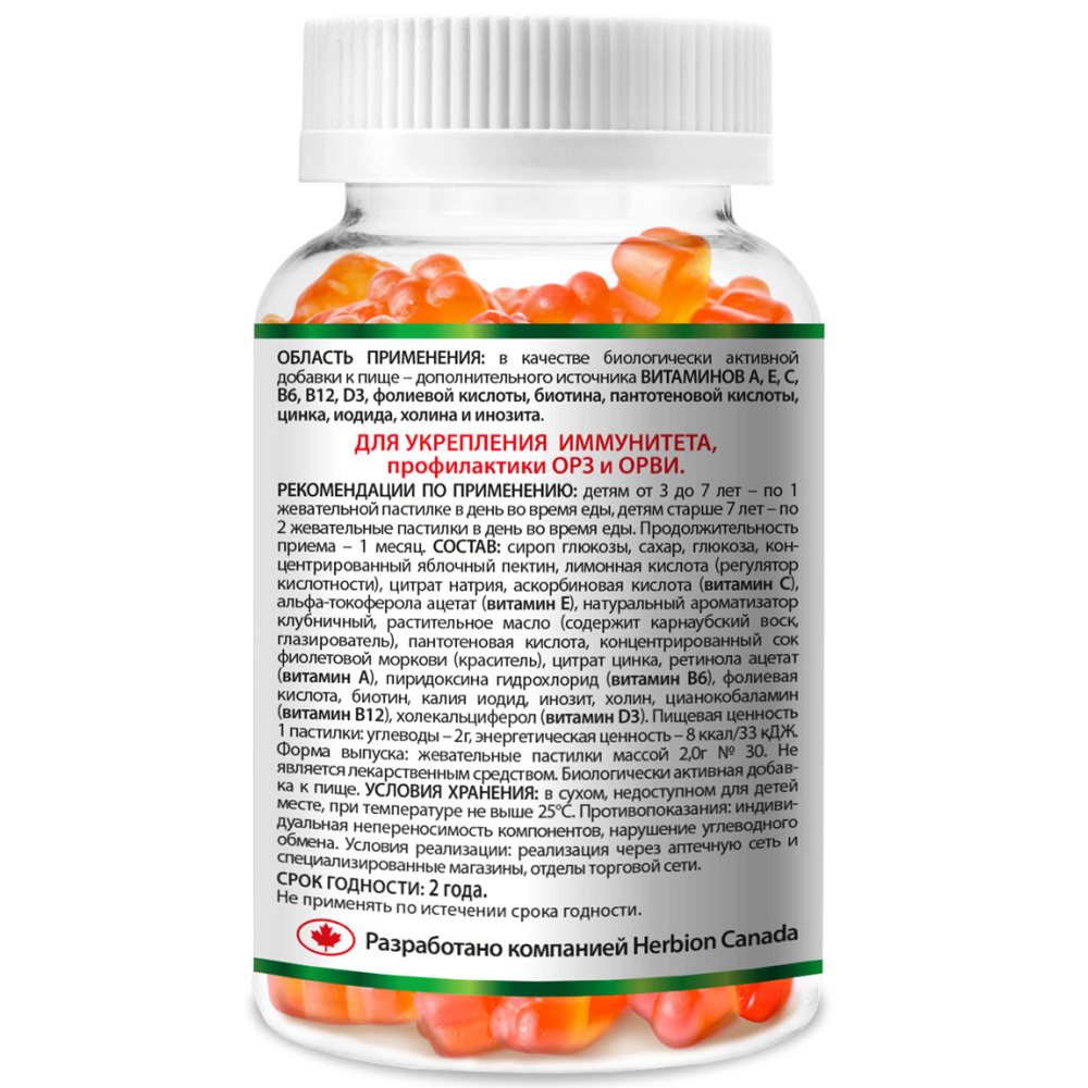 Сироп глюкозы, сахар, глюкоза, пектин, сок концентрированный яблочный, лимонная кислота (регулятор кислотности), цитрат натрия, аскорбиновая кислота (витамин С), альфа-токоферола ацетат (витамин Е), натуральный ароматизатор клубничный, растительное масло (содержит карнаубский воск, глазирователь), пантотеновая кислота, концентрированный сок фиолетовой моркови (краситель), цитрат цинка, ретинола ацетат (витамин А), пиридоксина гидрохлорид (витамин В6), фолиевая кислота, биотин, калий йодид, инозит, холин, цианокабаламин (витамин В12), холекальциферол (витамин Д3).
