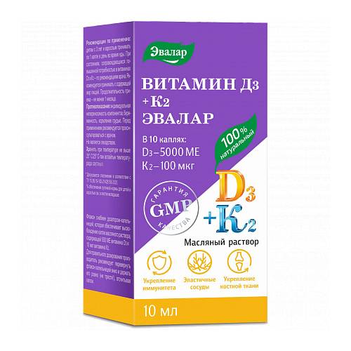 Витамин Д3 500 МЕ + К2 в каплях от компании «Эвалар» содержит популярный витамин D, усиленный натуральным витамином К2, который дополняет действие витамина D и помогает ему лучше усваиваться. Витамин Д3 500 МЕ + К2 способствует укреплению иммунитета, нормализации кальциевого обмена – направляет кальций в костные ткани, препятствуя его отложению в сосудах (безопасное усвоение кальция), повышению эластичности сосудов, предотвращению кальцификации тканей (снижению скорости старения), поддержанию здоровья костей, зубов.