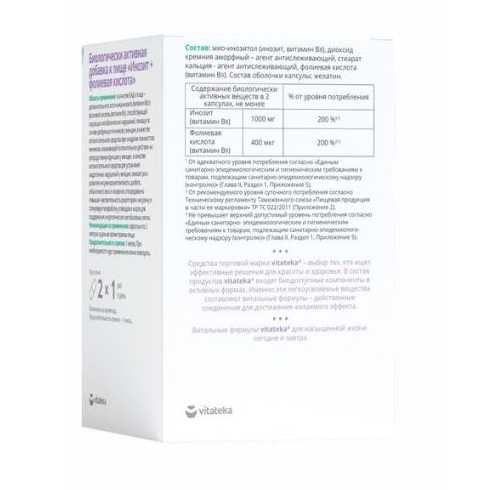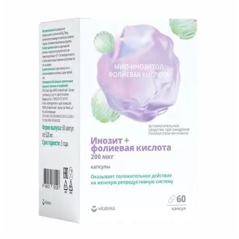 Биологически активная добавка к пище, дополнительный источник инозита (витамин В8) и фолиевой кислоты (витамин В9). Способствует коррекции метаболических нарушений, лежащих в основе дисфункции яичников у женщин, в качестве вспомогательного средства при синдроме поликистоза яичников, оказывающей положительное действие на репродуктивную функцию у женщин, в качестве вспомогательного средства для устранения андрогенных нарушений у женщин, снижает риск развития инсулинорезистентности, диабета, избыточного веса и ожирения, опосредованно повышая чувствительность рецепторов к инсулину и стимулируя переработку углеводов и жиров для поддержания энергетического метаболизма клетки.