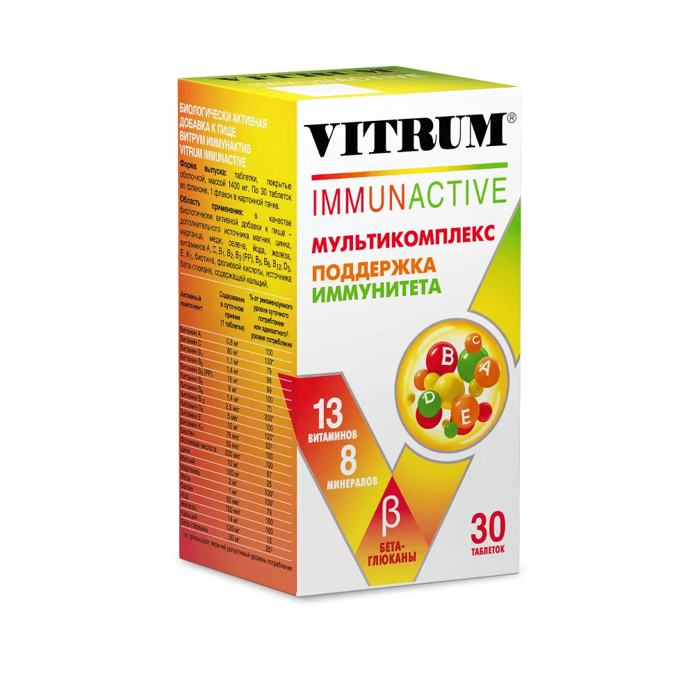 Витаминно-минеральный комплекс Витрум Иммунактив содержит 13 витаминов и 8 минералов, а также бета-глюканы и биофлавоноидный комплекс - необходимые компоненты, которые синергично работают для поддержки иммунитета.