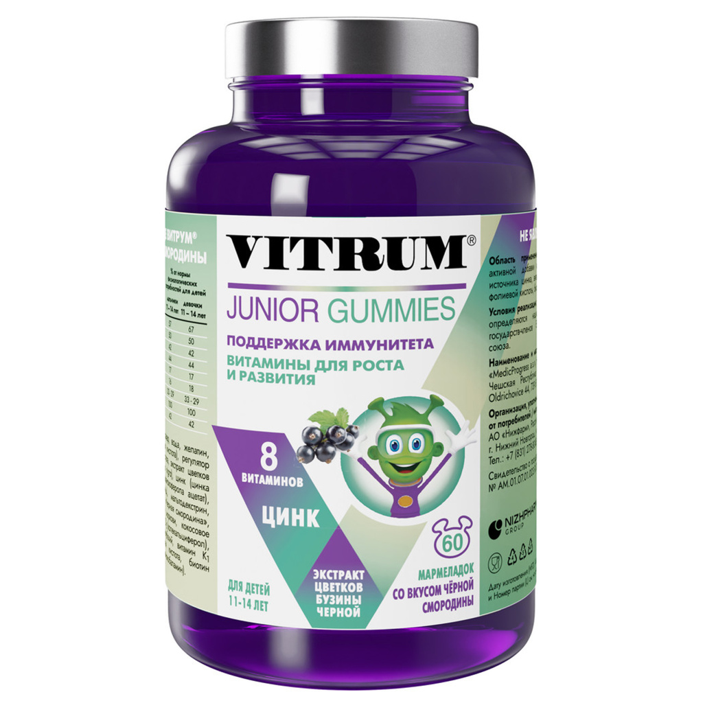 Все аналогиВитрум юниор мармеладки со вкусом черной смородины - это специально разработанный комплекс витаминов и минералов, который рекомендуется для детей от 11 лет и старше. В составе мармеладок присутствует широкий спектр витаминов и минералов, в том числе витамины А, Е, С, D, В6, В12, кальций, железо и цинк, которые помогают поддерживать здоровье костей и зубов, улучшать зрение, иммунитет, нервную и сердечно-сосудистую системы. Мармеладки имеют приятный вкус черной смородины, что делает их применение приятным для ребенка. Не является лекарственным средством. Перед применением рекомендуется проконсультироваться с врачом.