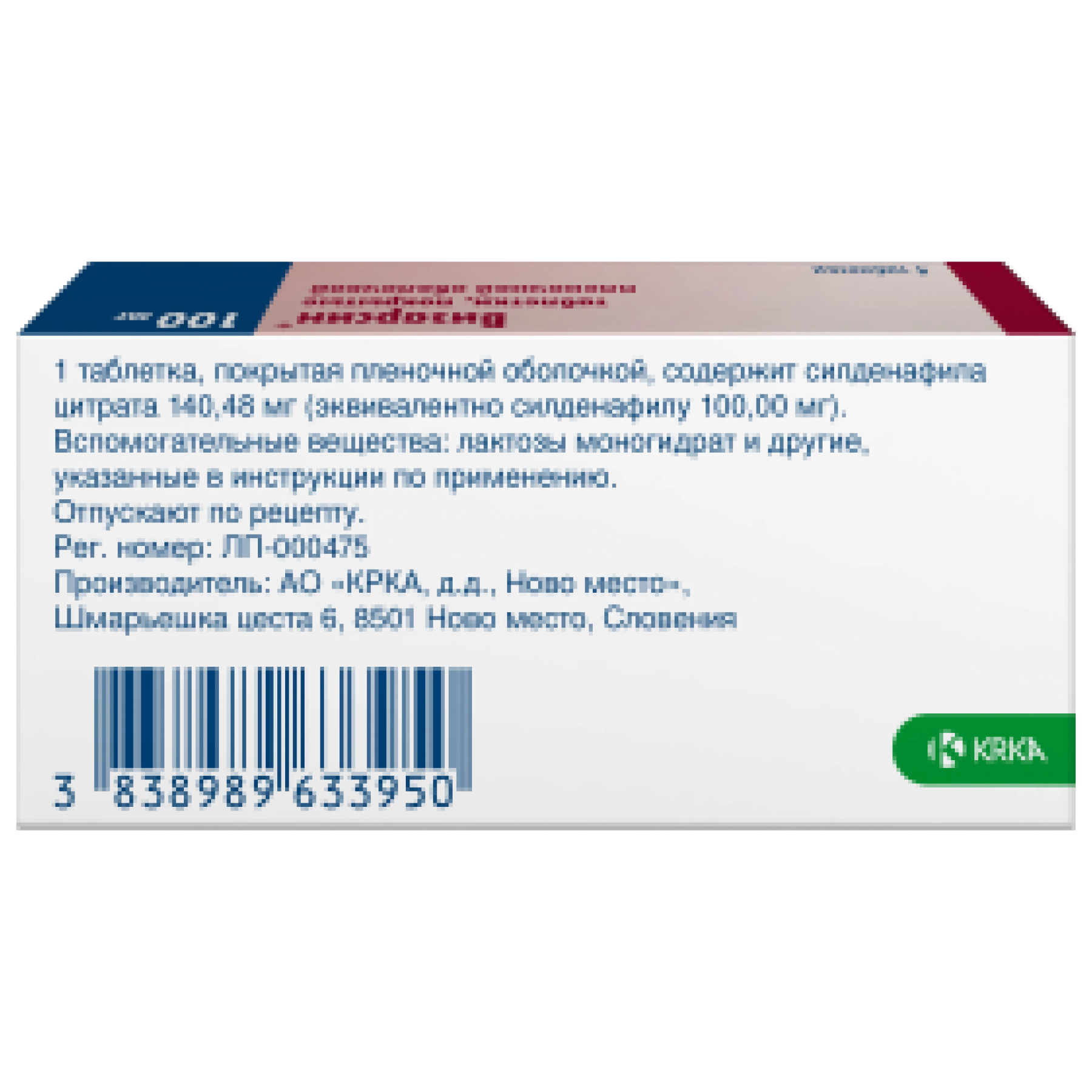 Действующее вещество: силденафила цитрат 140,48 мг (эквивалентно силденафилу 100,00 мг);
