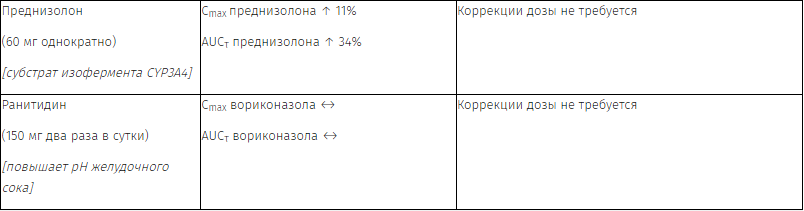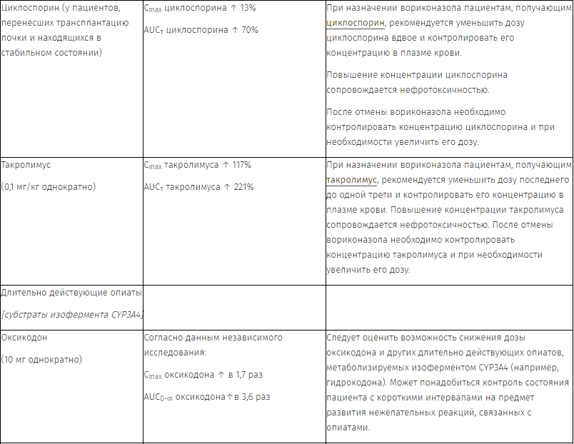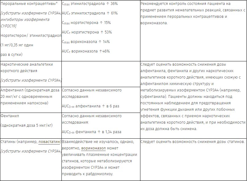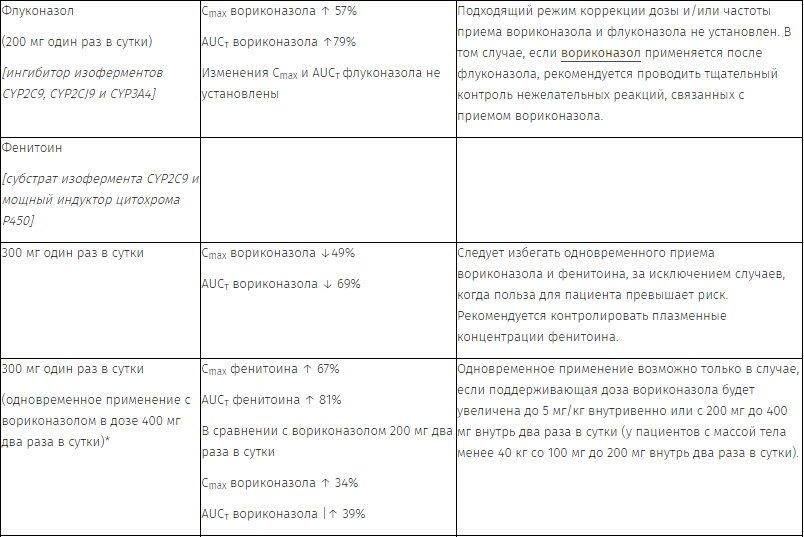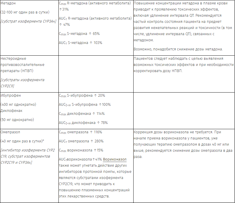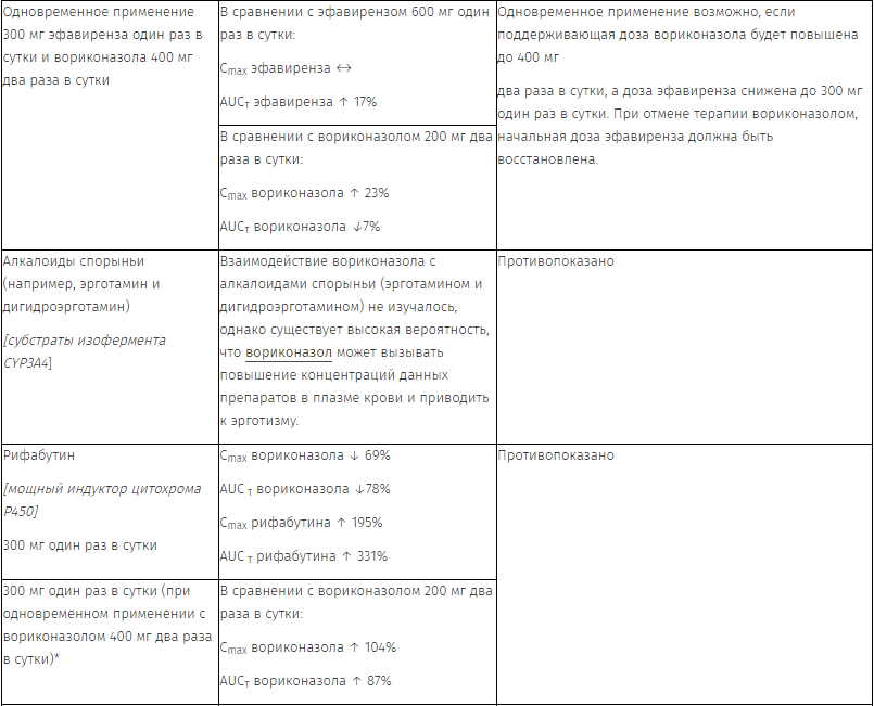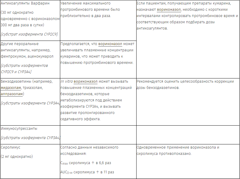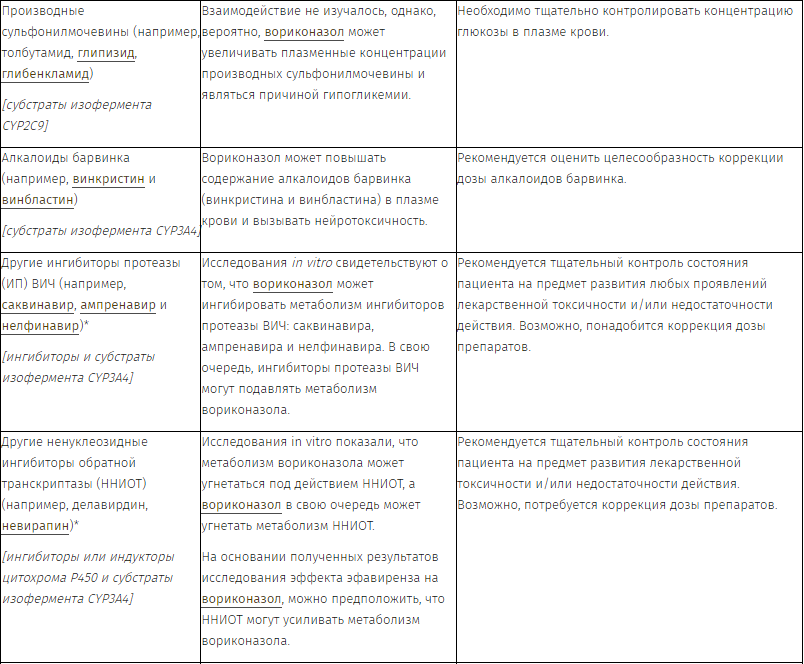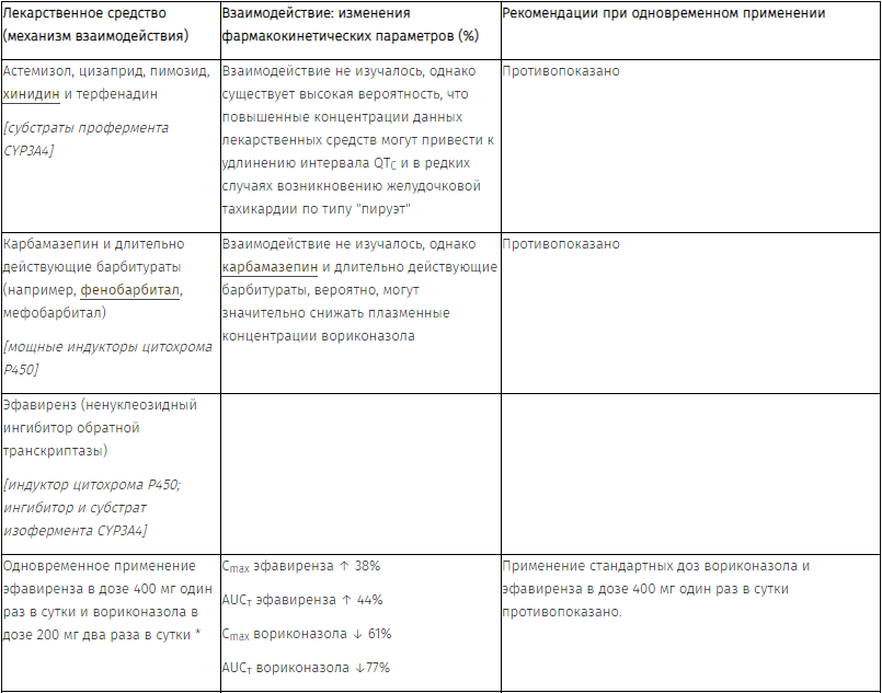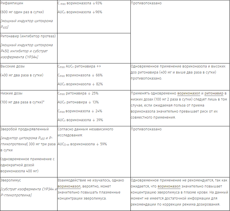 Взаимодействие вориконазола с другими лекарственными средствами и рекомендации при одновременном применении представлены в таблице ниже: