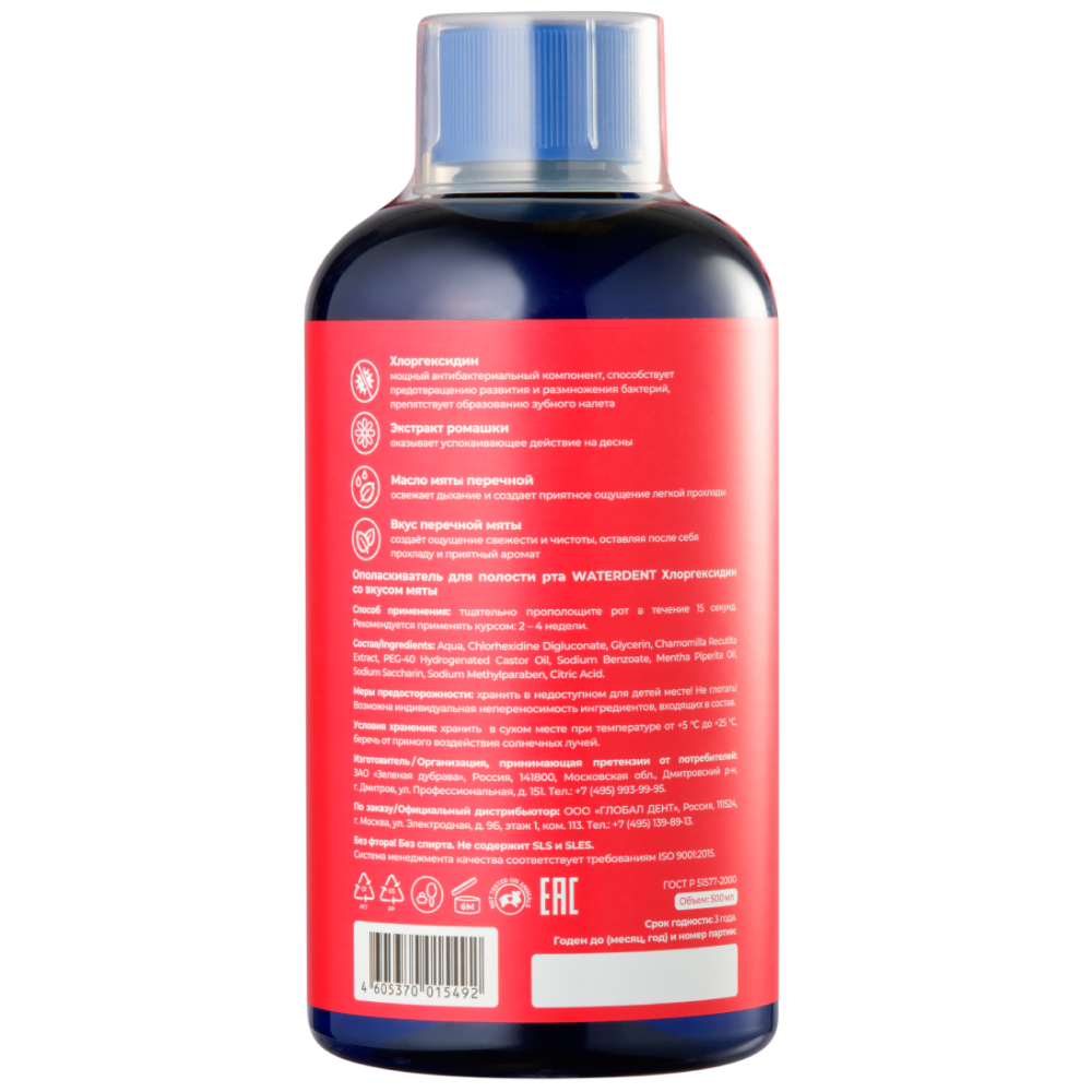 Инструкция по применению Waterdent 500 мл ополаскиватель для полости рта хлоргексидин мята без фтора