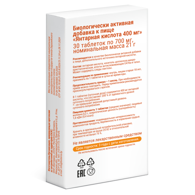 В 1 таблетке (суточная доза) содержится 400 мг янтарной кислоты, что составляет 200 % от адекватного уровня суточного потребления.