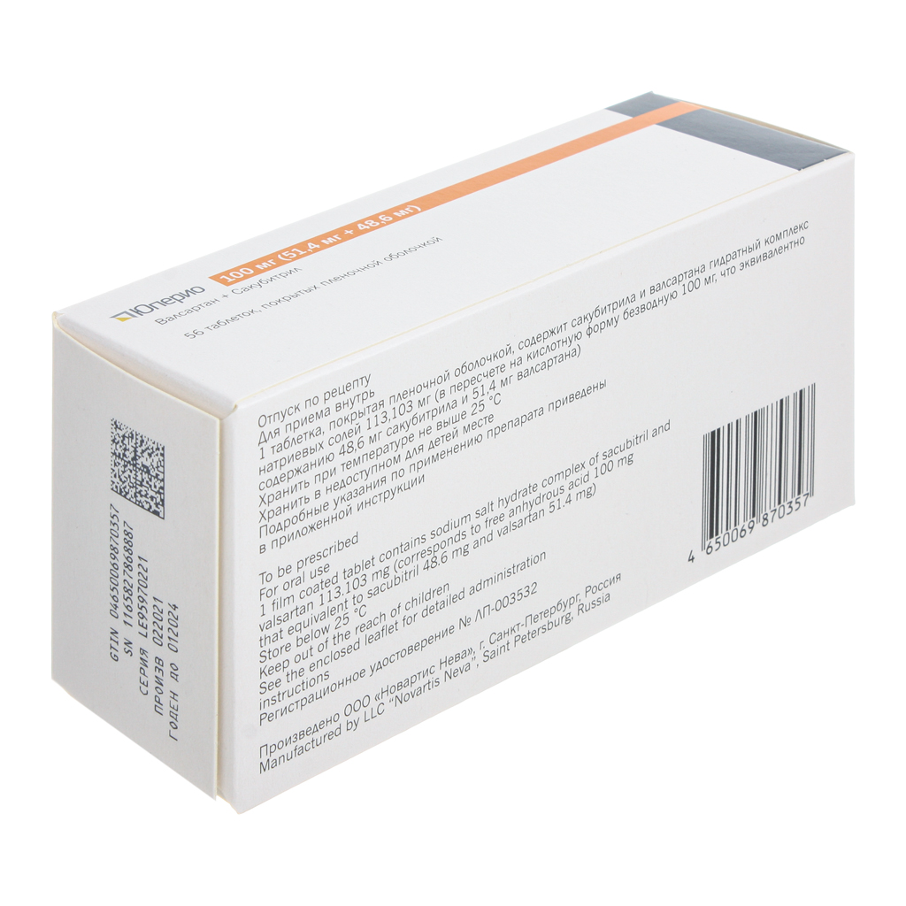 Активные вещества: сакубитрила и валсартана гидратный комплекс натриевых солей 113.103 мг, в пересчете на кислотную форму безводную 100 мг, что соответствует содержанию валсартана 51.4 мг, что соответствует содержанию сакубитрила 48.6 мг.