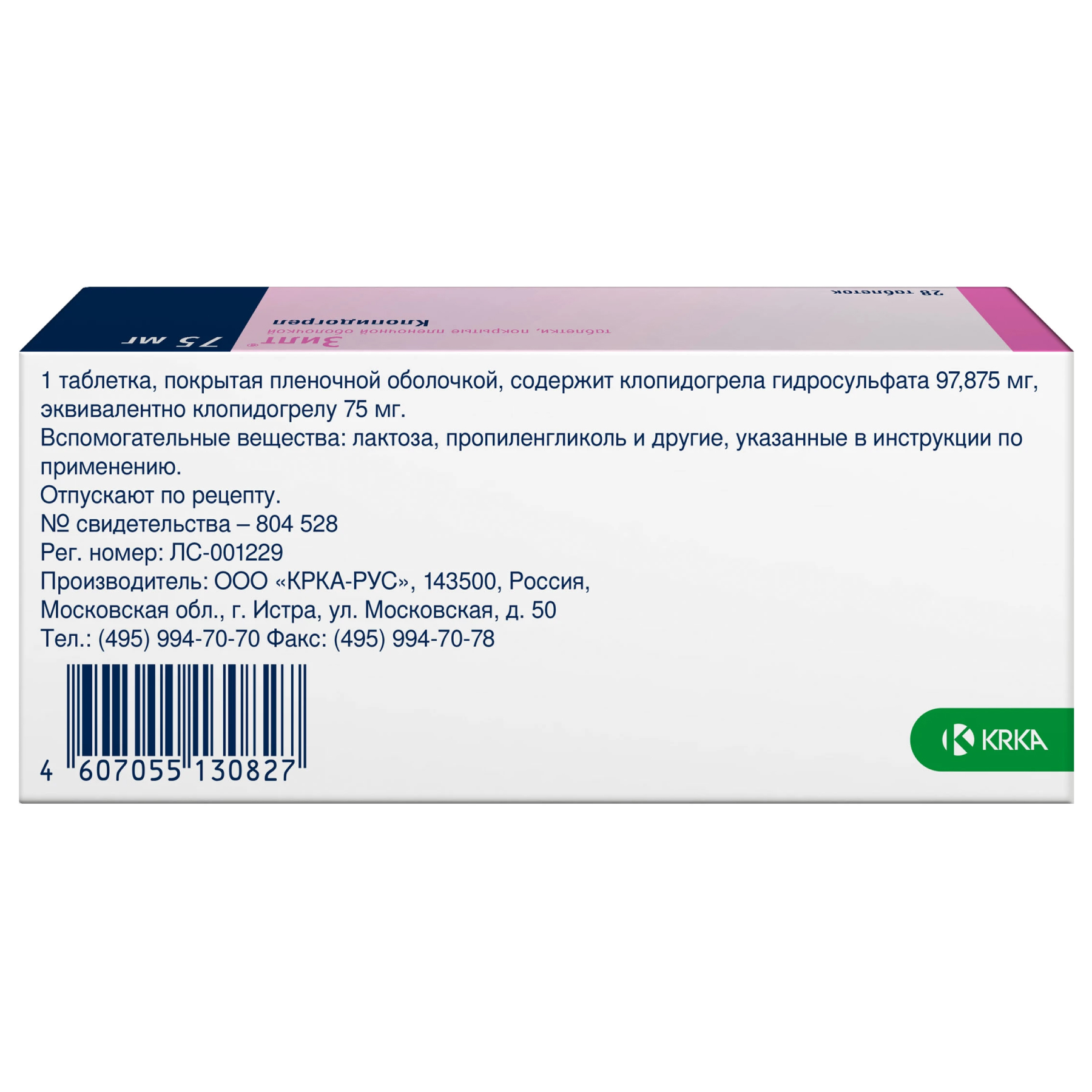 Активное вещество: клопидогрела гидросульфат 97,875 мг, что соответствует содержанию клопидогрела 75мг.
