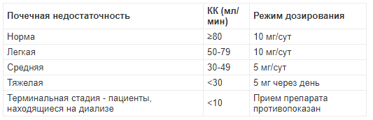 У пациентов с почечной недостаточностью средней степени тяжести и у пациентов, находящихся на гемодиализе (КК < 7 мл/мин), при приеме препарата внутрь в дозе 10 мг T1/2 увеличивается в 3 раза, а общий клиренс снижается на 70% относительно пациентов с нормальной функцией почек, что требует соответствующего изменения режима дозирования.
