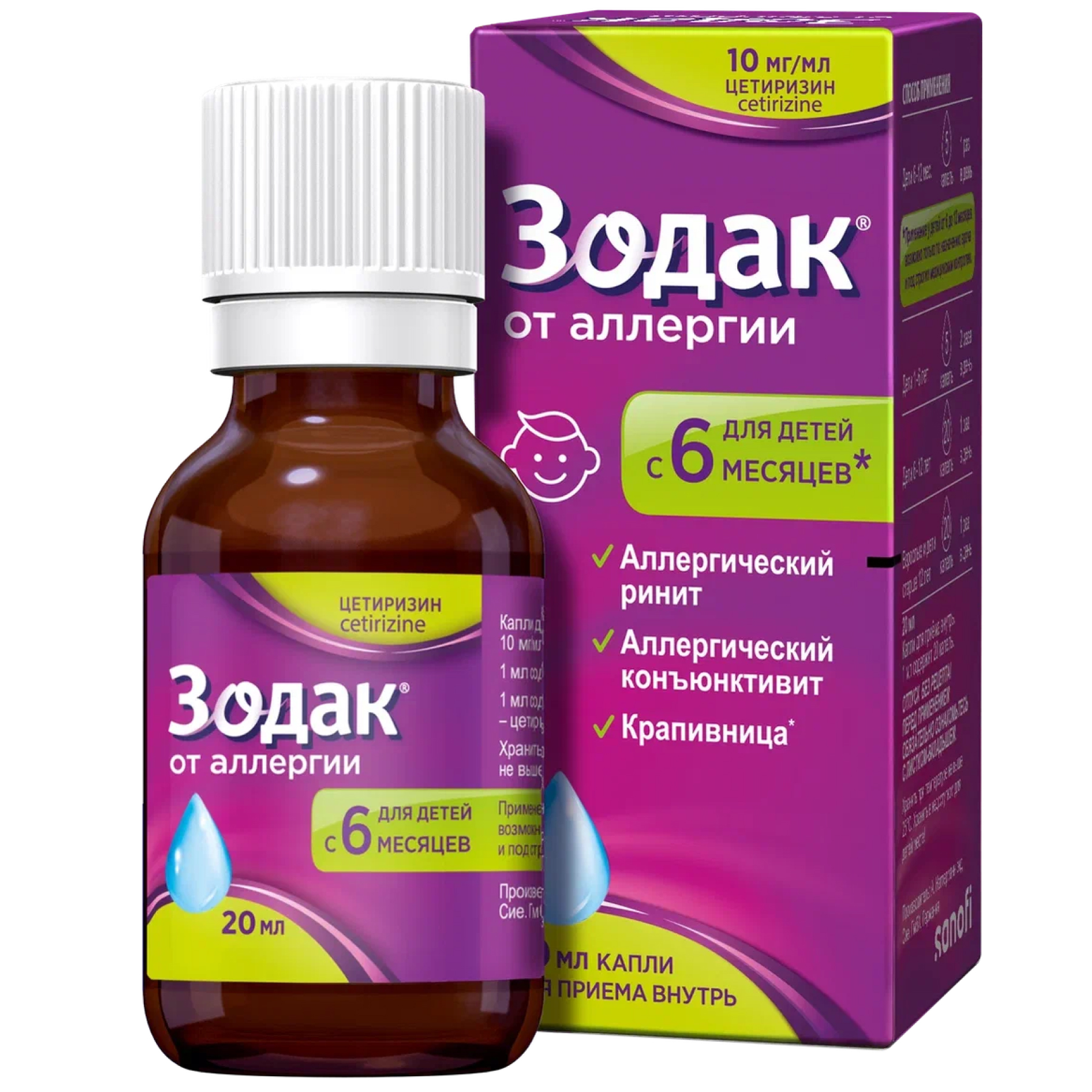 Детям в возрасте от 2 до 6 лет: по 5 мг цетиризина (10 капель) 1 раз/сут или 2.5 мг цетиризина (5 капель) 2 раза/сут, утром и вечером.