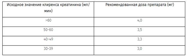 Рекомендуемые дозы у пациентов с нарушением функции почек легкой и умеренной степени тяжести (значения клиренса креатинина 30-60 мл/мин) приведены ниже.