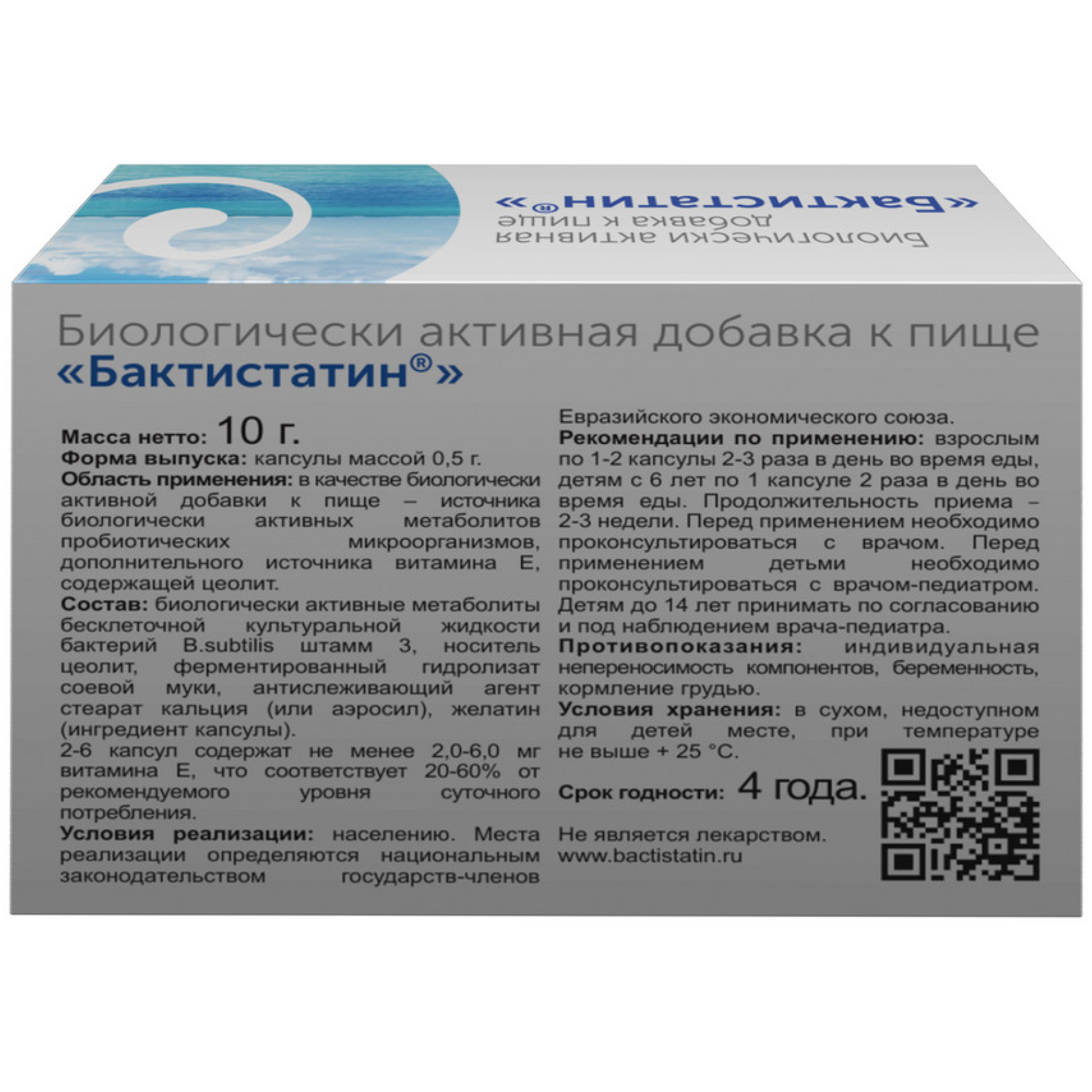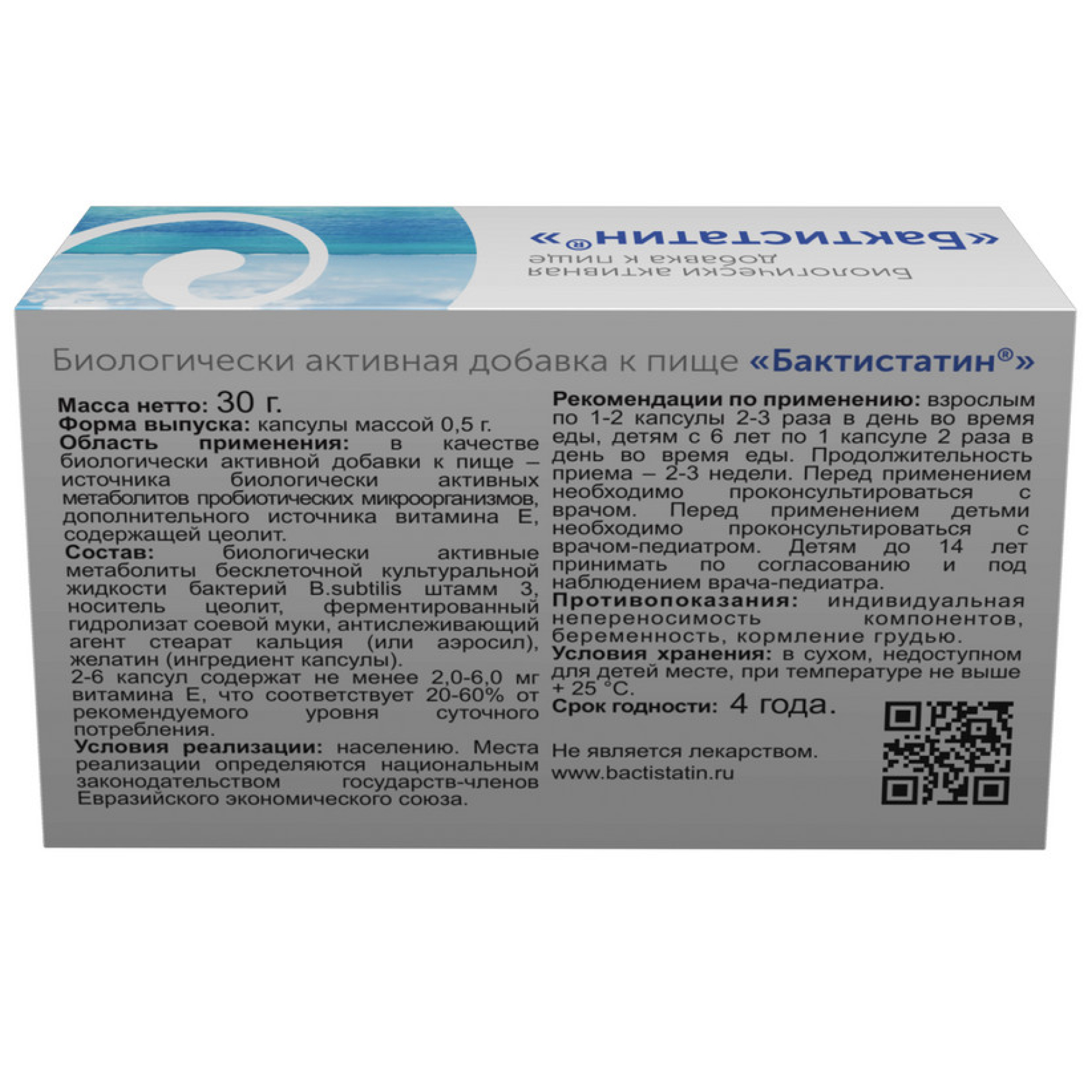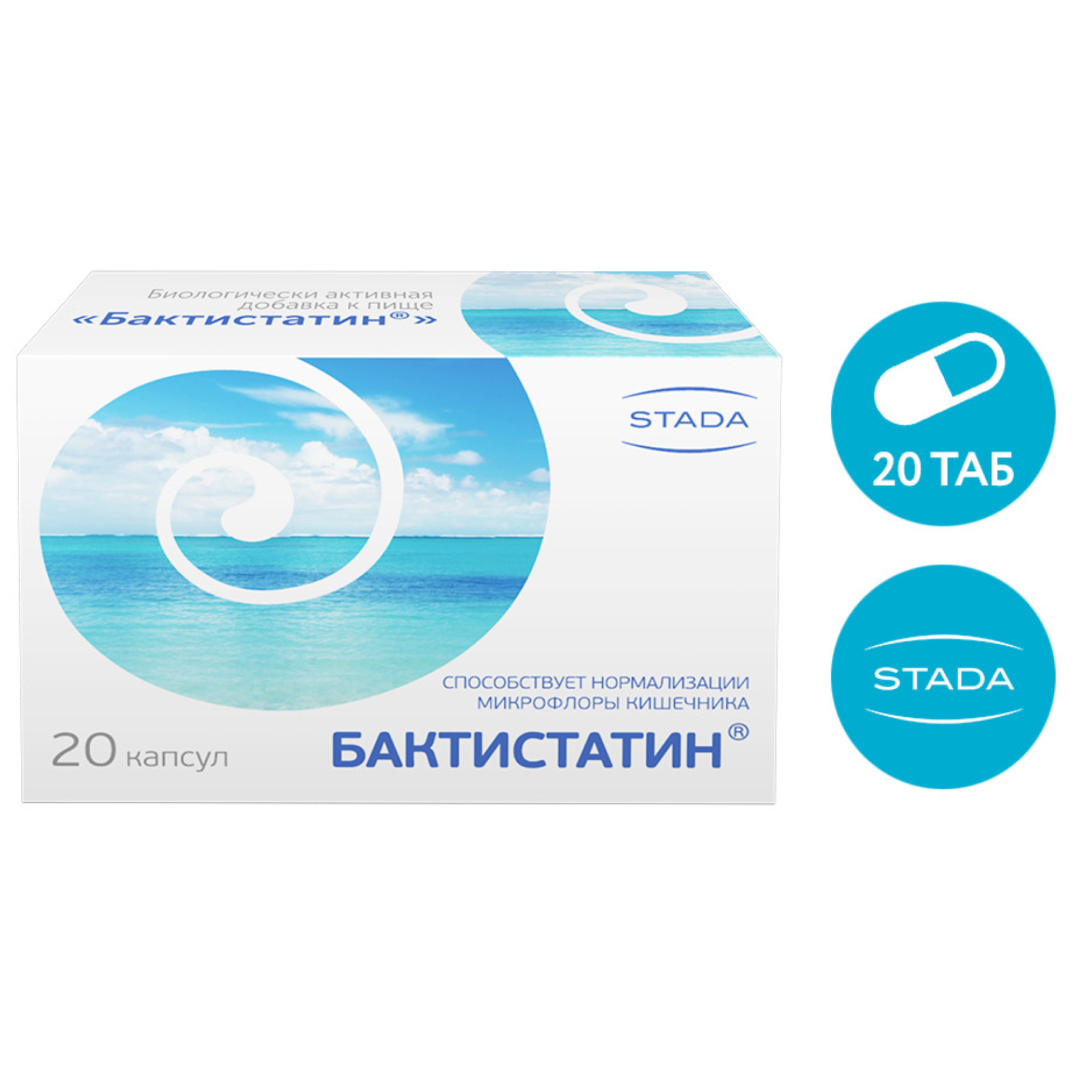 Бактистатин представляет собой капсулы массой по 500 мг. Они упаковываются в блистеры, которые укладываются в картонные пачки. В упаковке может быть 20 или 60 капсул, а также инструкция по применению Бактистатина.