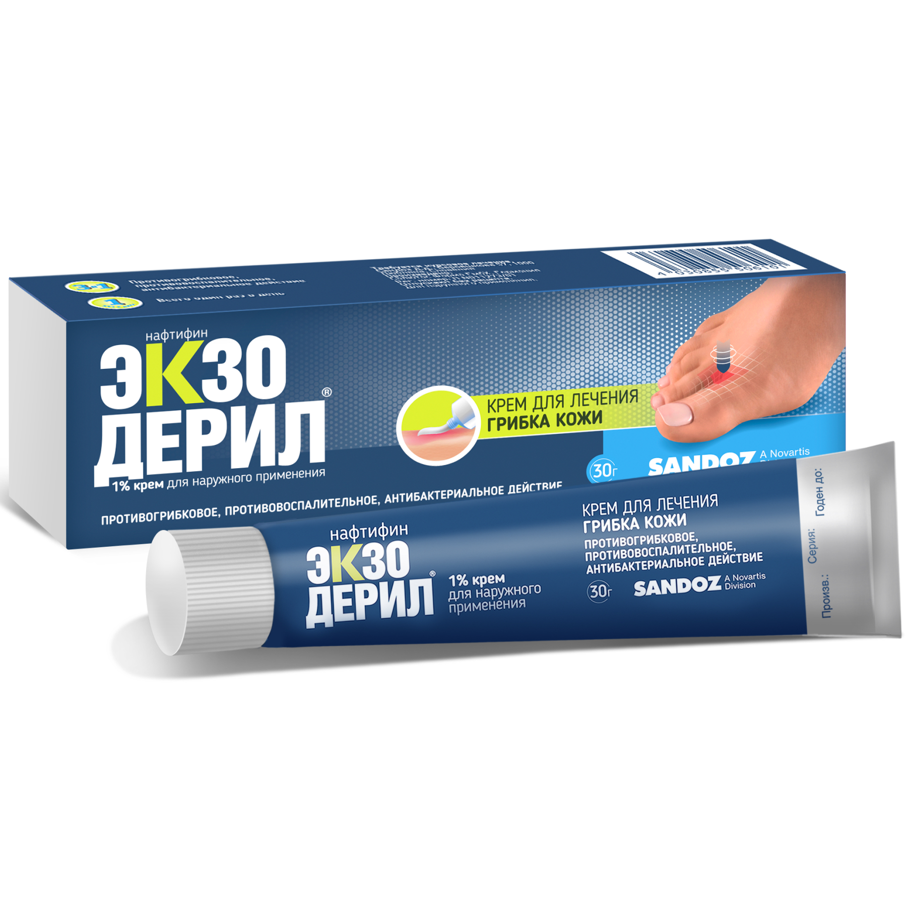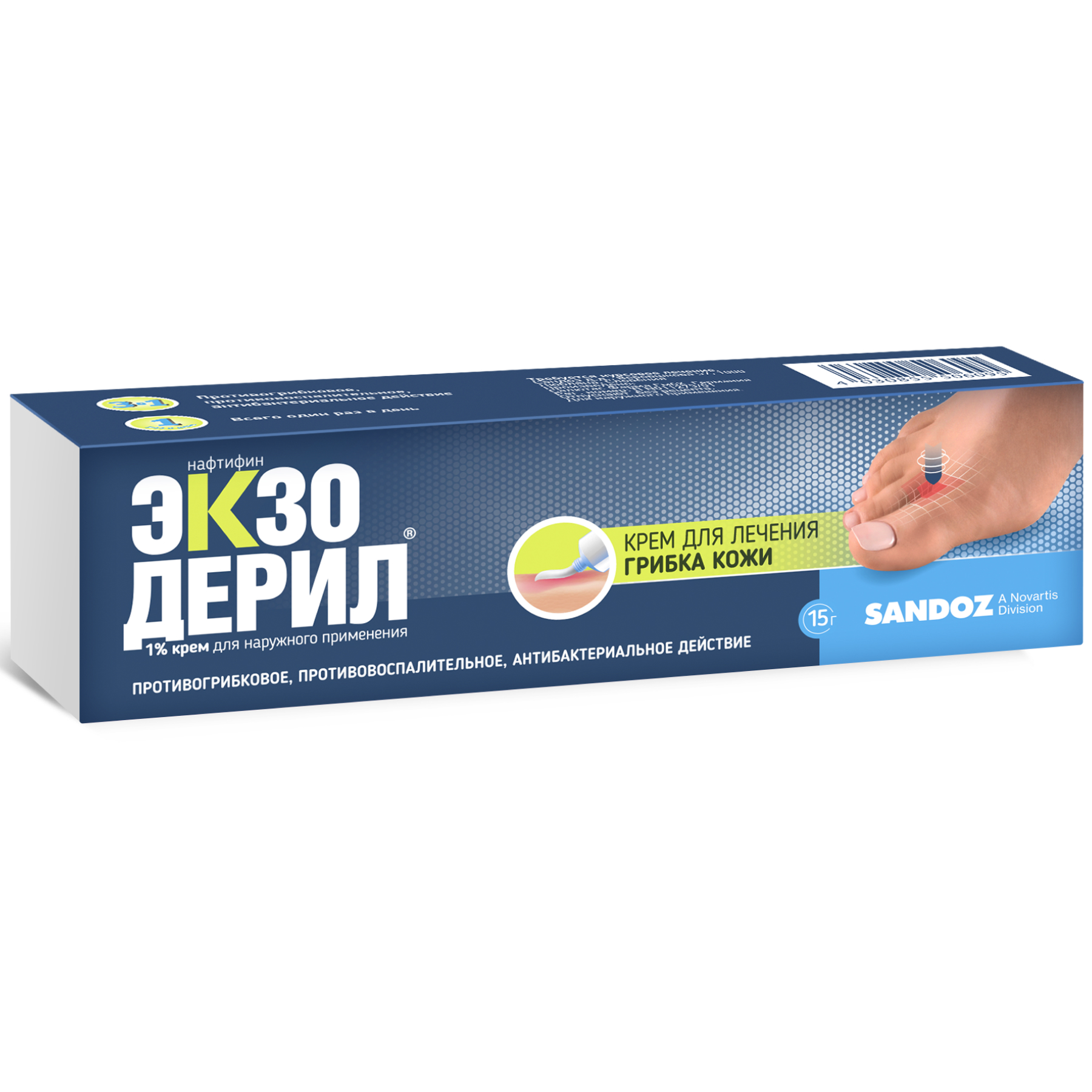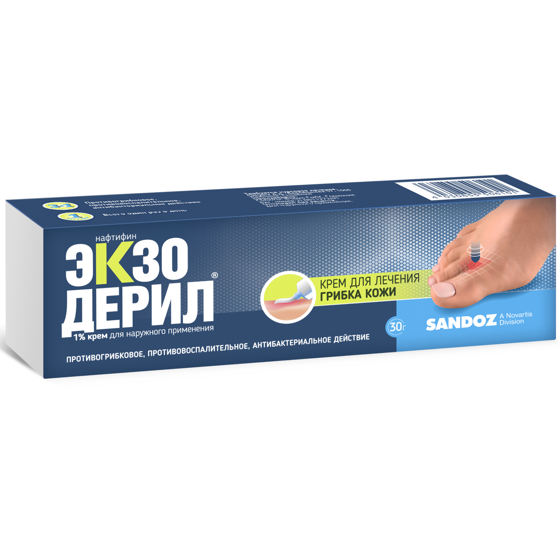 Средство в любой форме укладывается в картонные пачки, внутри которых также находится инструкция по применению Экзодерила.
