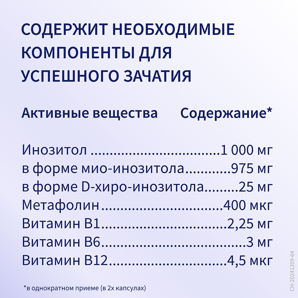 - Активные формы инозита. Этот элемент повышает шансы зачатия и ускоряет его путем поддержки регулярного менструального цикла, овуляции и созревания здоровых яйцеклеток. D-хиро-инозитол нормализует уровень половых гормонов. Мио-инозитол способствует активизации метаболизма. Пропорции форм – одна часть D-хиро-инозитола и 40 частей мио-инозитола. Такие показатели соответствуют их физиологическому соотношению в плазме крови женщины. Эта комбинация помогает поддерживать нормальный цикл менструаций.