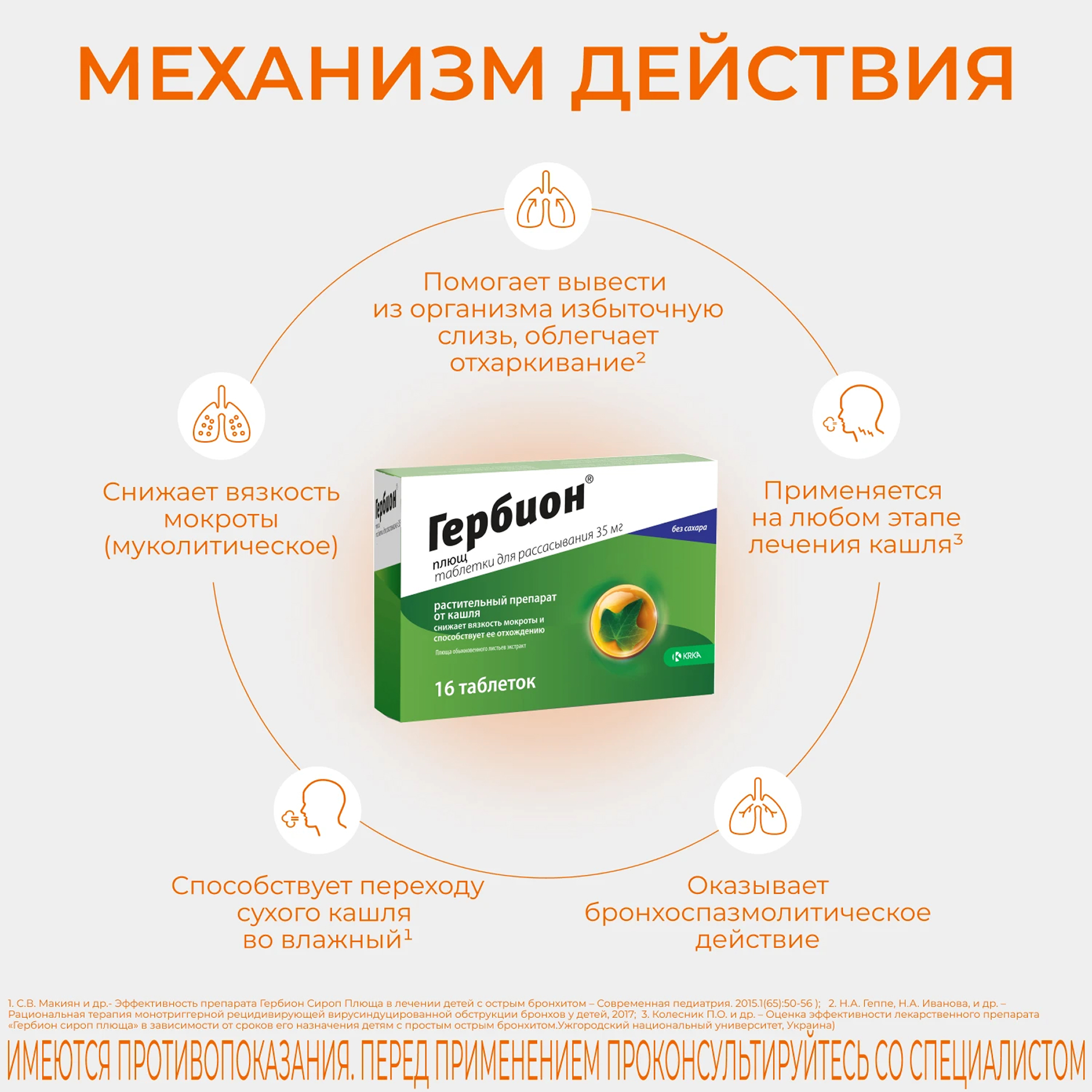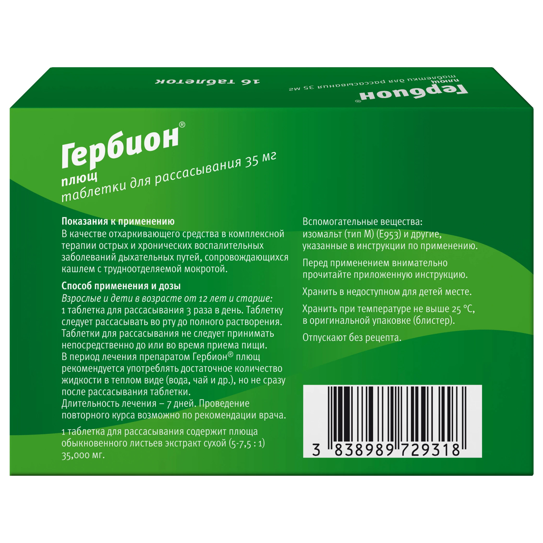 Гербион не следует принимать одновременно с противокашлевыми средствами, угнетающими кашлевой рефлекс (например, кодеином), так как это может затруднить выведение мокроты.