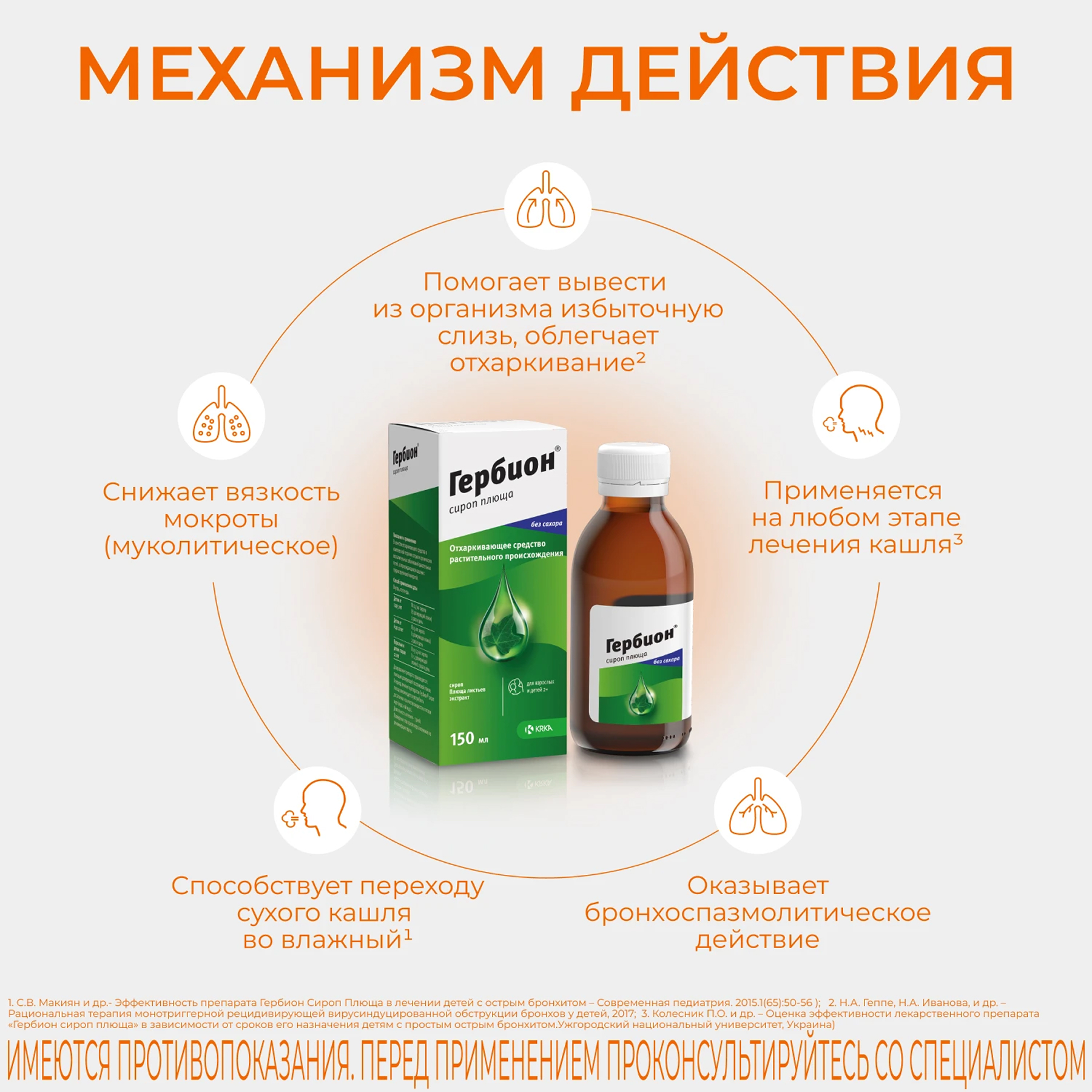 Все аналогиГербион — это растительный препарат, предназначенный для лечения кашля различного происхождения. Средство выпускается в виде сиропов с натуральными растительными компонентами и используется при сухом и влажном кашле у взрослых и детей.