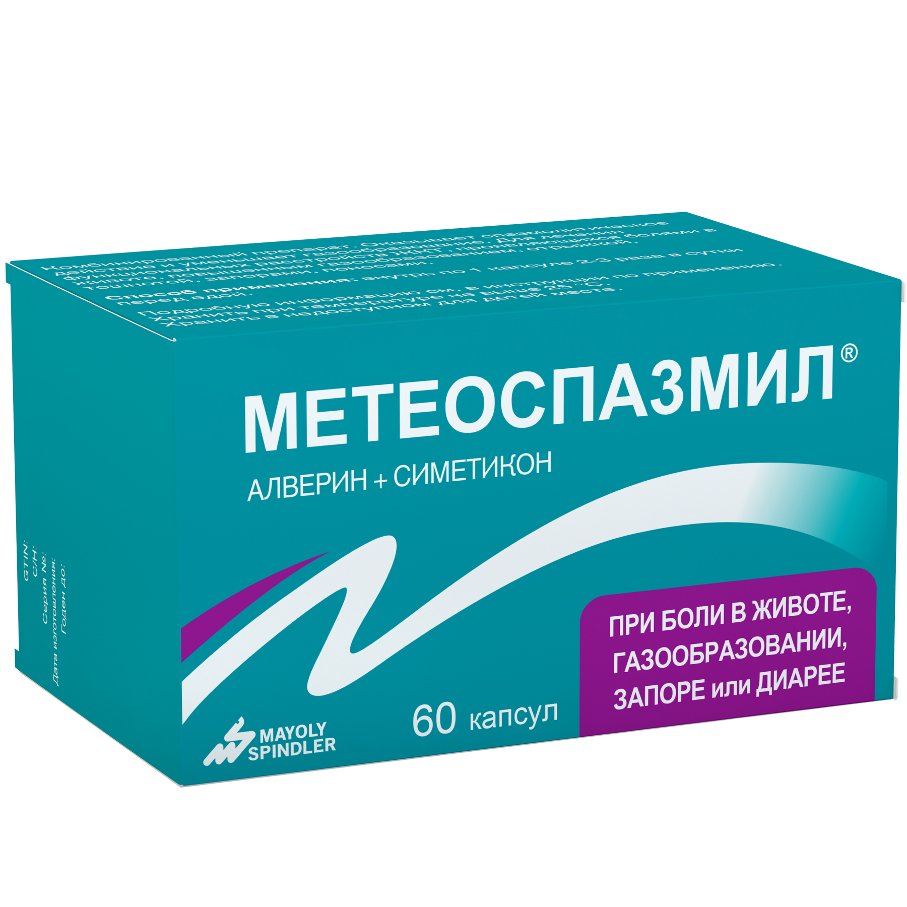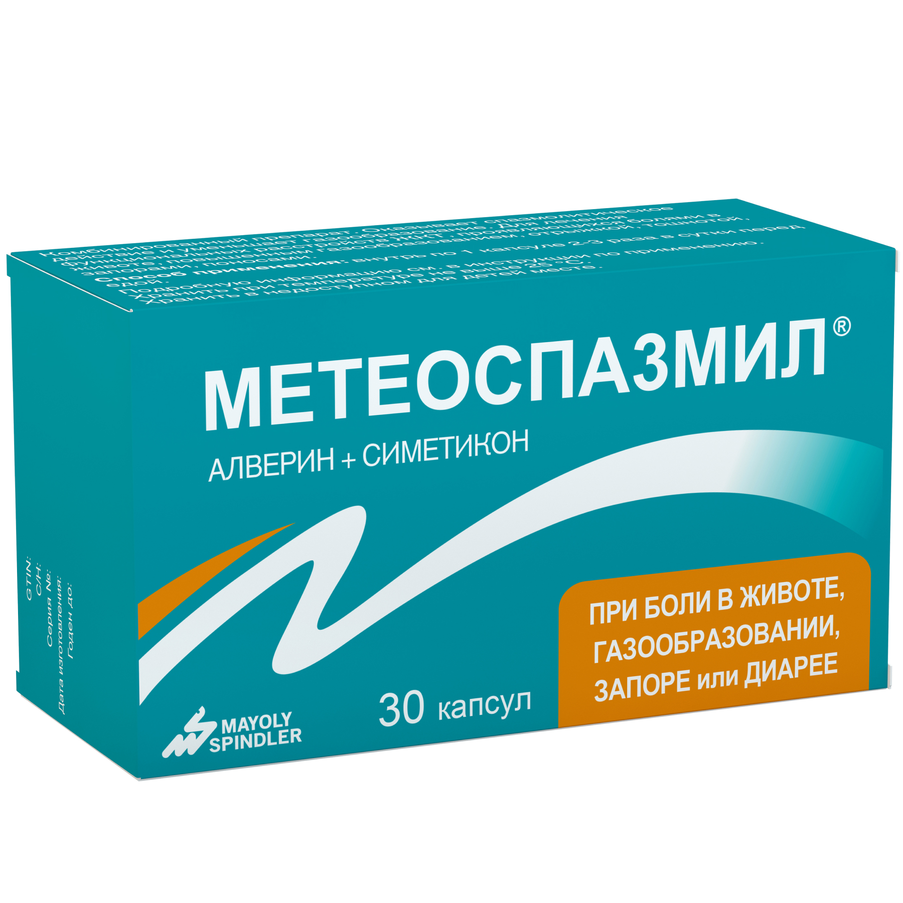 Препарат отпускают в аптеке без рецепта врача. Цена Метеоспазмила зависит от количества капсул. В упаковке есть инструкция по применению с подробным описанием медикамента.