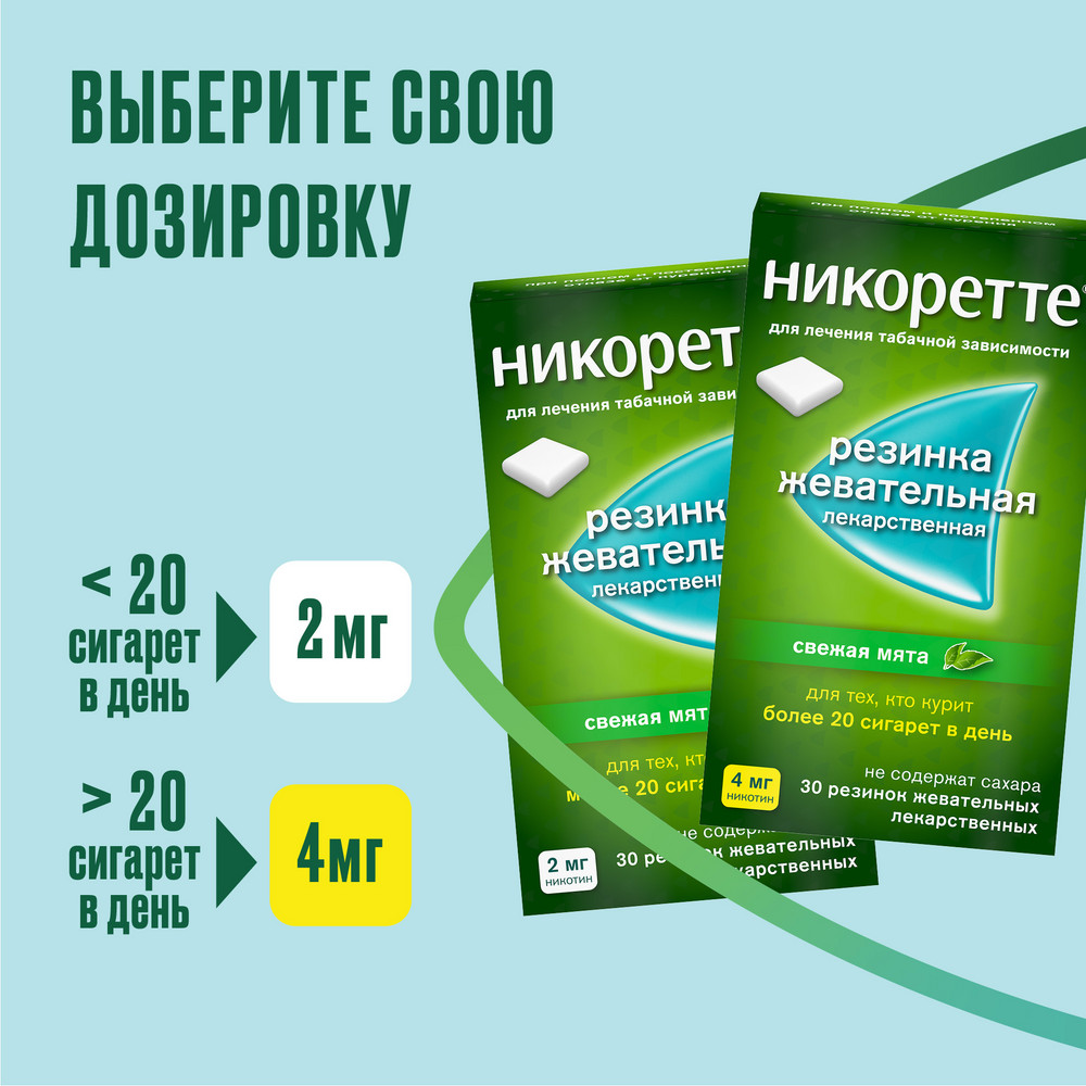 Жевательные резинки 2 мг имеют умеренное содержание никотина. Их применяют, если человек выкуривает меньше 20 сигарет в сутки или первую сигарету спустя полчаса после пробуждения. Препарат 4 мг имеют повышенное содержание никотина. Его используют, если человек выкуривает больше 20 сигарет в сутки и не может бросить курить при применении резинки 2 мг.