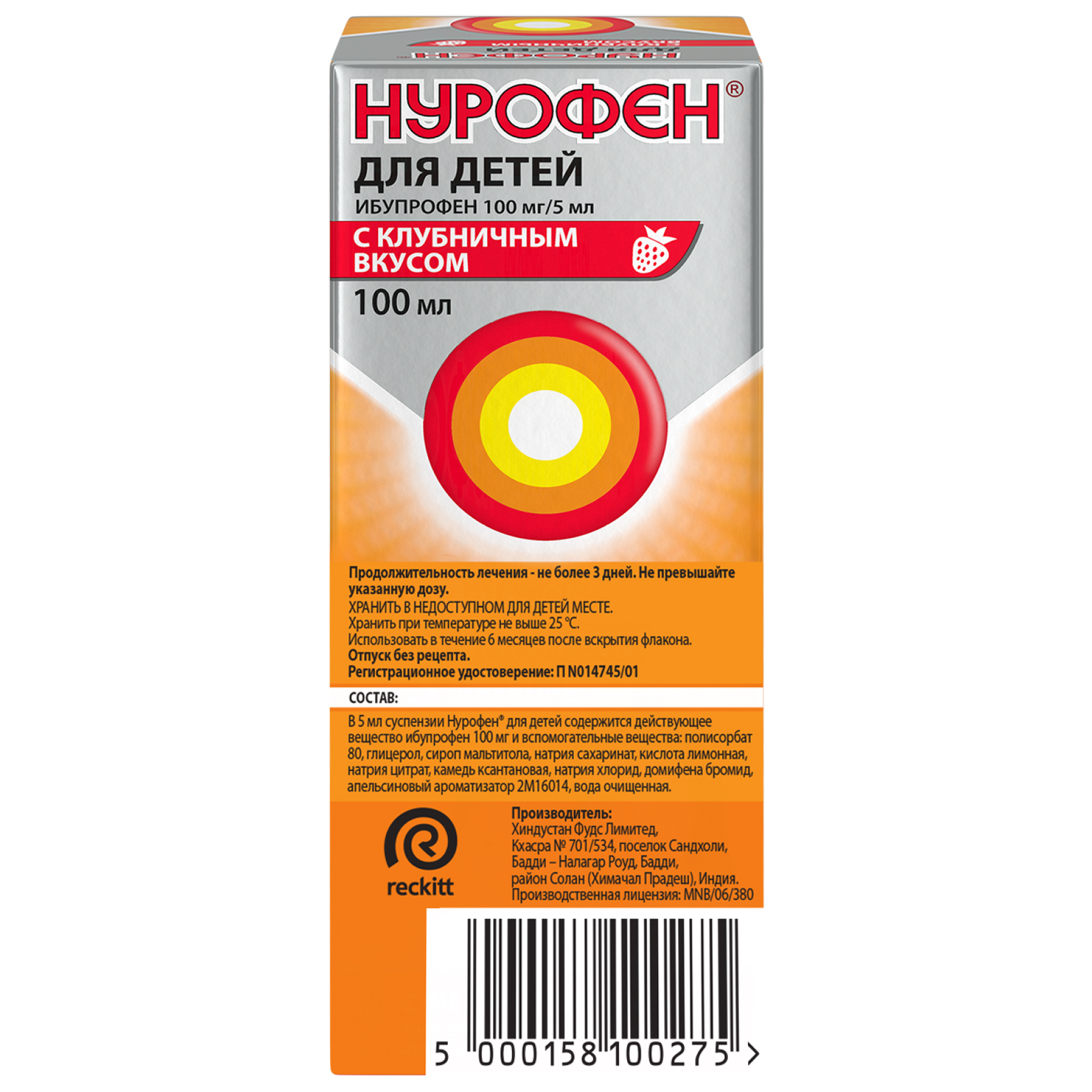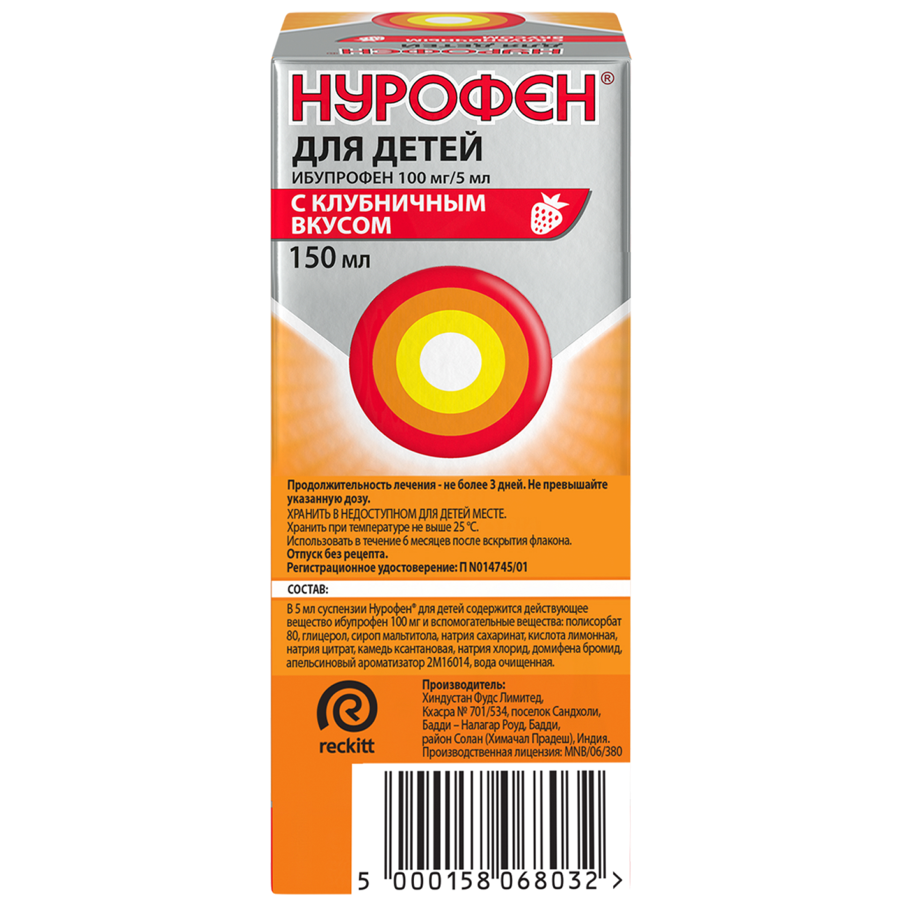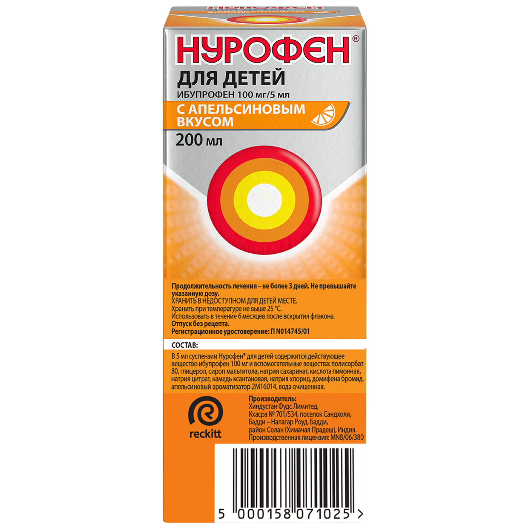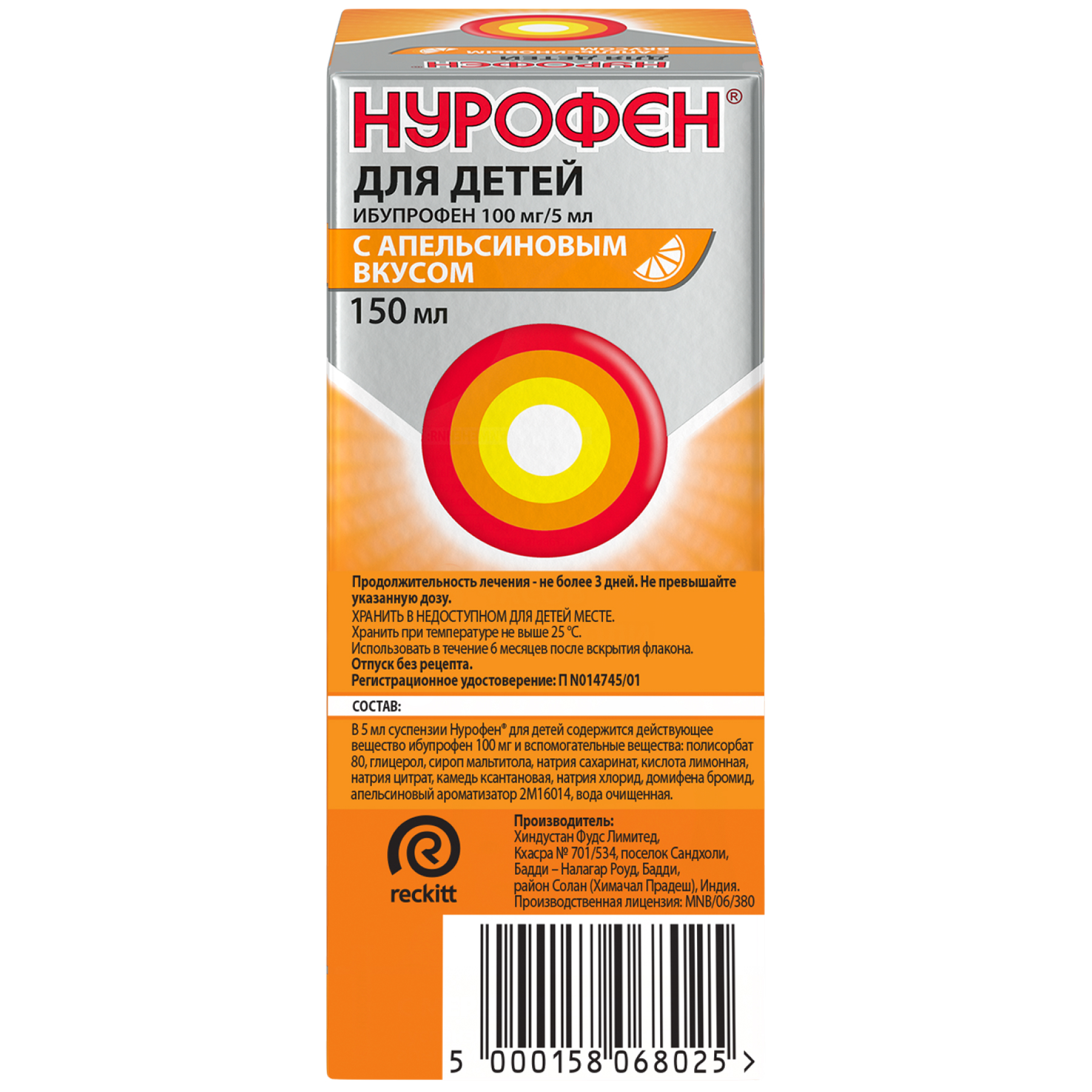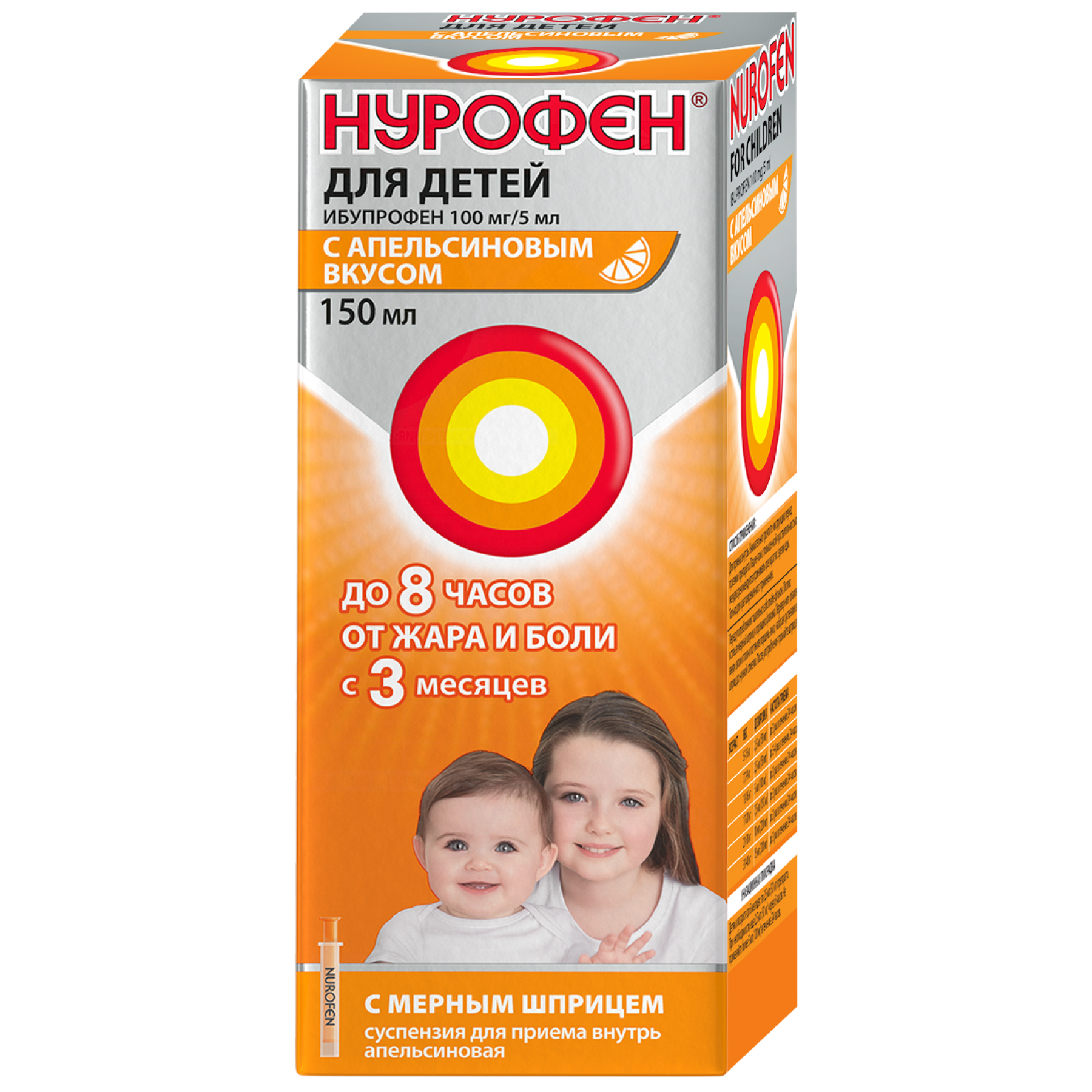 Нурофен 100 мг/5 мл 150 мл суспензия для приема внутрь для детей апельсин