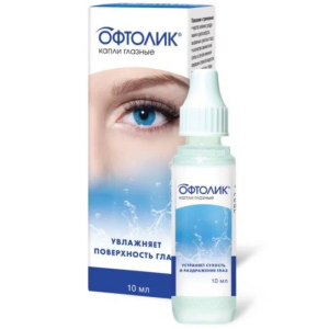Капли Офтолик – комбинированное лекарственное средство, которое оказывает защитное действие на роговицу глаза при недостаточной секреции слезной жидкости. Повидон и поливиниловый спирт обладают свойствами лубриканта. Покрывая поверхность глаза, действующие компоненты уменьшают напряжение и раздражение органа зрения.