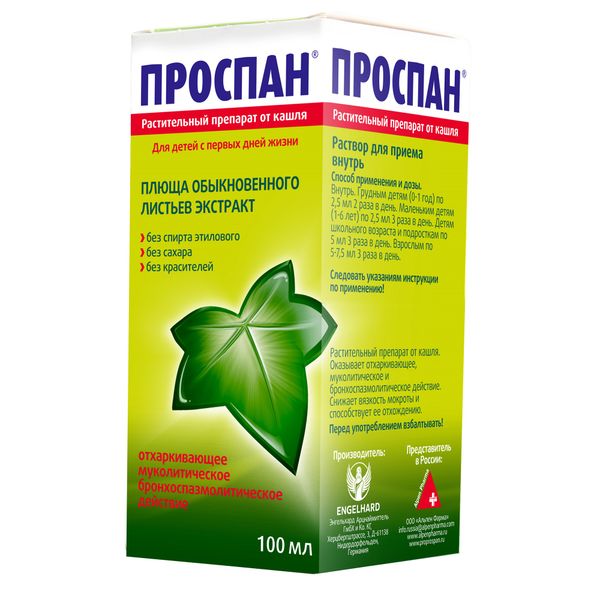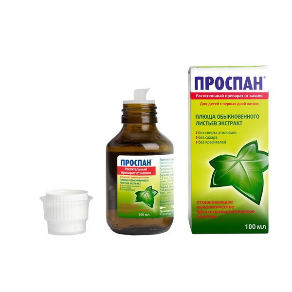 Проспан раствор подходит для взрослых и детей, включая малышей с 1 года, благодаря натуральному составу и хорошей переносимости.Основное действующее вещество — сухой экстракт листьев плюща (Hedera helix L.). Он содержит сапонины, обладающие отхаркивающими свойствами, а также способствует расслаблению гладкой мускулатуры бронхов.