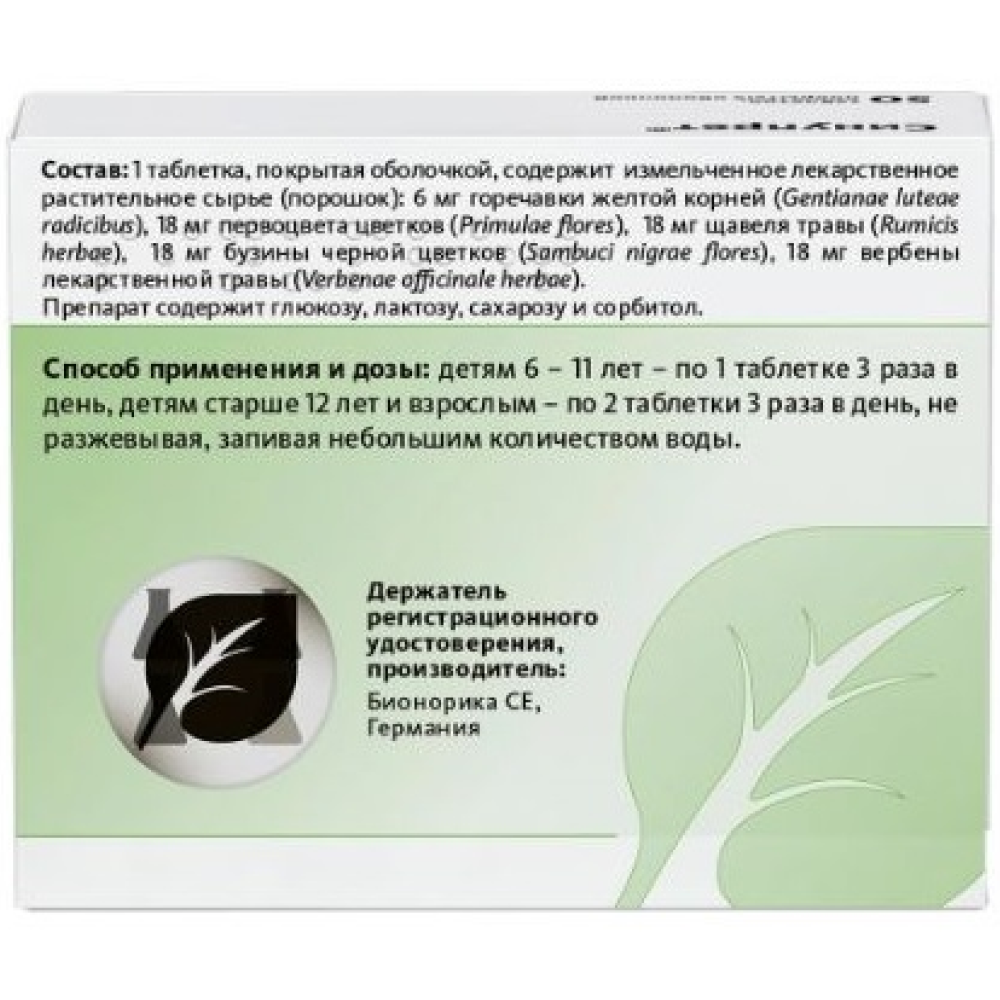 В 100 г капель лекарства содержится водно-спиртовой экстракт из 2,6 г смеси лекарственного растительного сырья (1:3:3:3:3): горечавки желтой корней, первоцвета цветков, щавеля травы, бузины черной цветков, вербены лекарственной травы — 29 г.