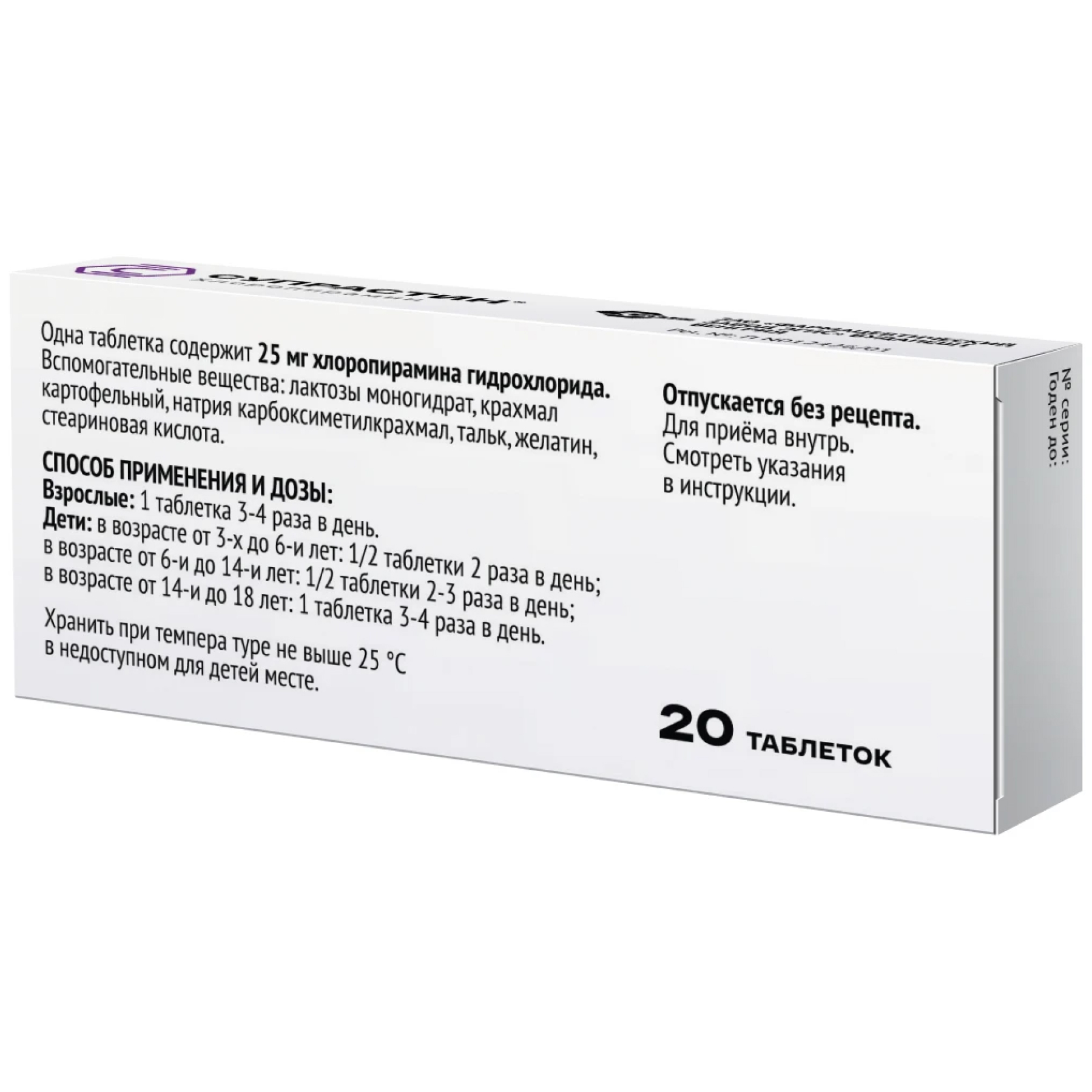 Способ применения Супрастина, оптимальную дозировку и продолжительность курса лечения подбирает врач. Взрослым пациентам рекомендуют пить во время еды по 25 мг три-четыре раза в день. Максимальная суточная доза 150 мг. При парентеральном введении разовая доза составляет 20-40 мг.
