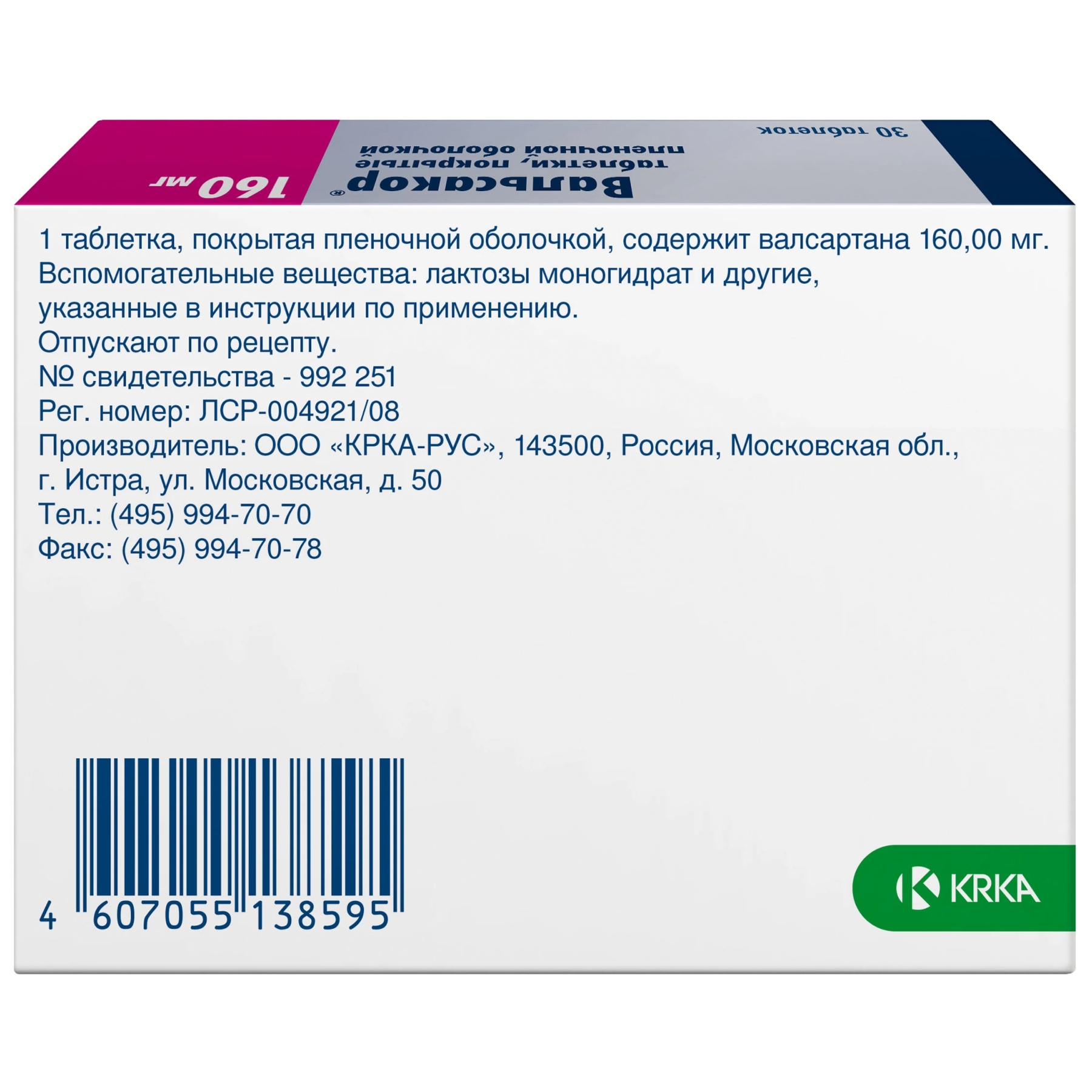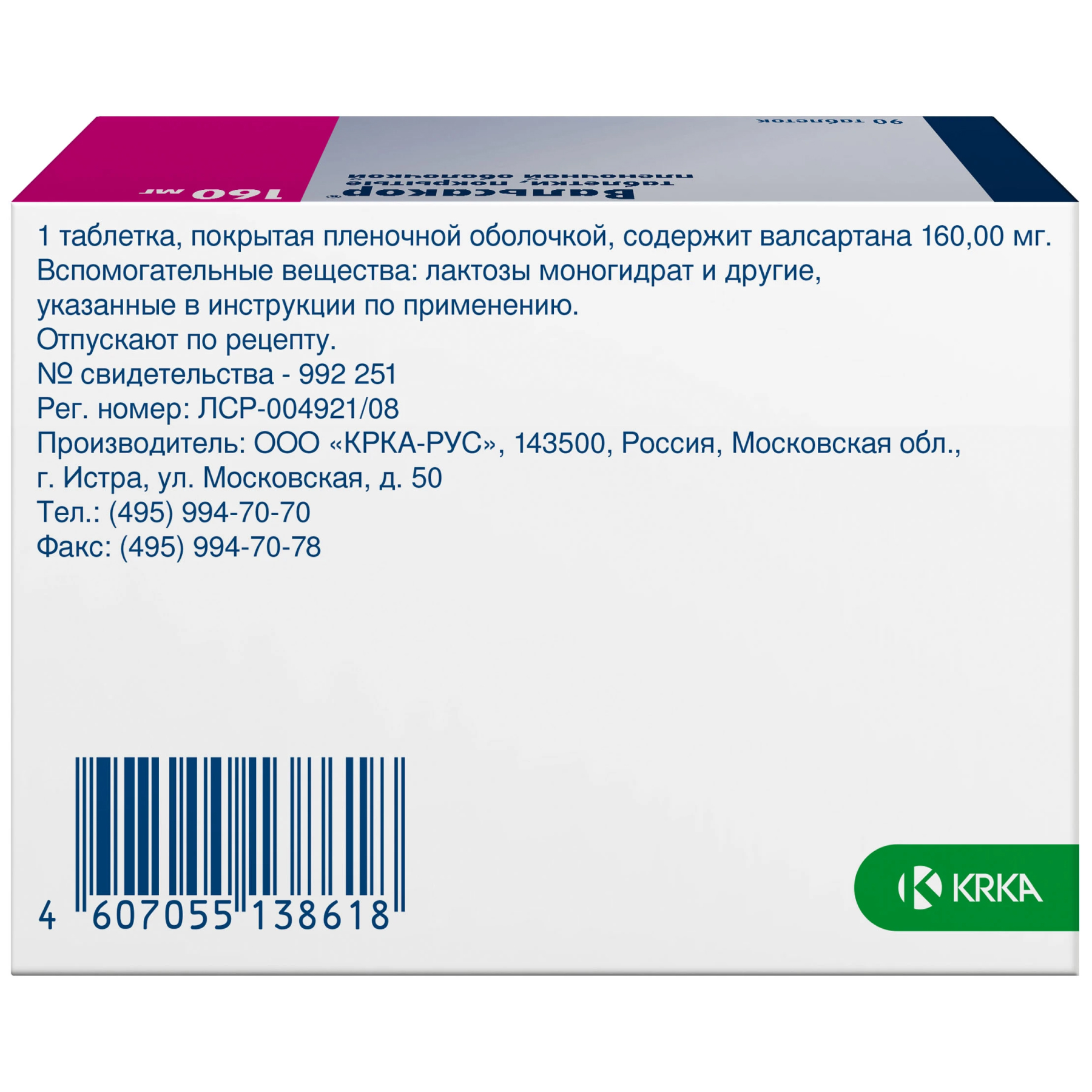 Вальсакор 160 мг 30 шт таблетки покрытые пленочной оболочкой