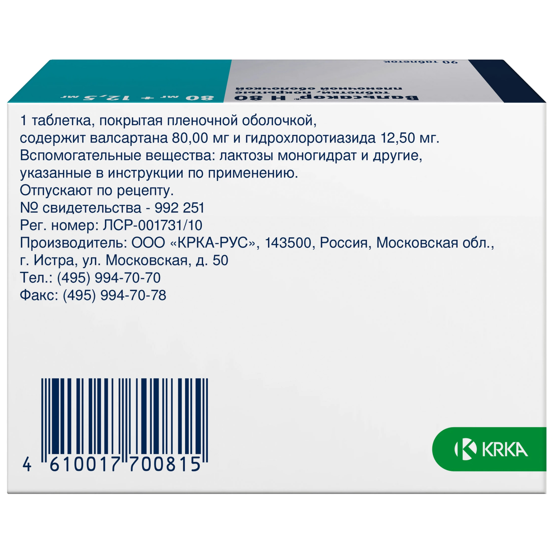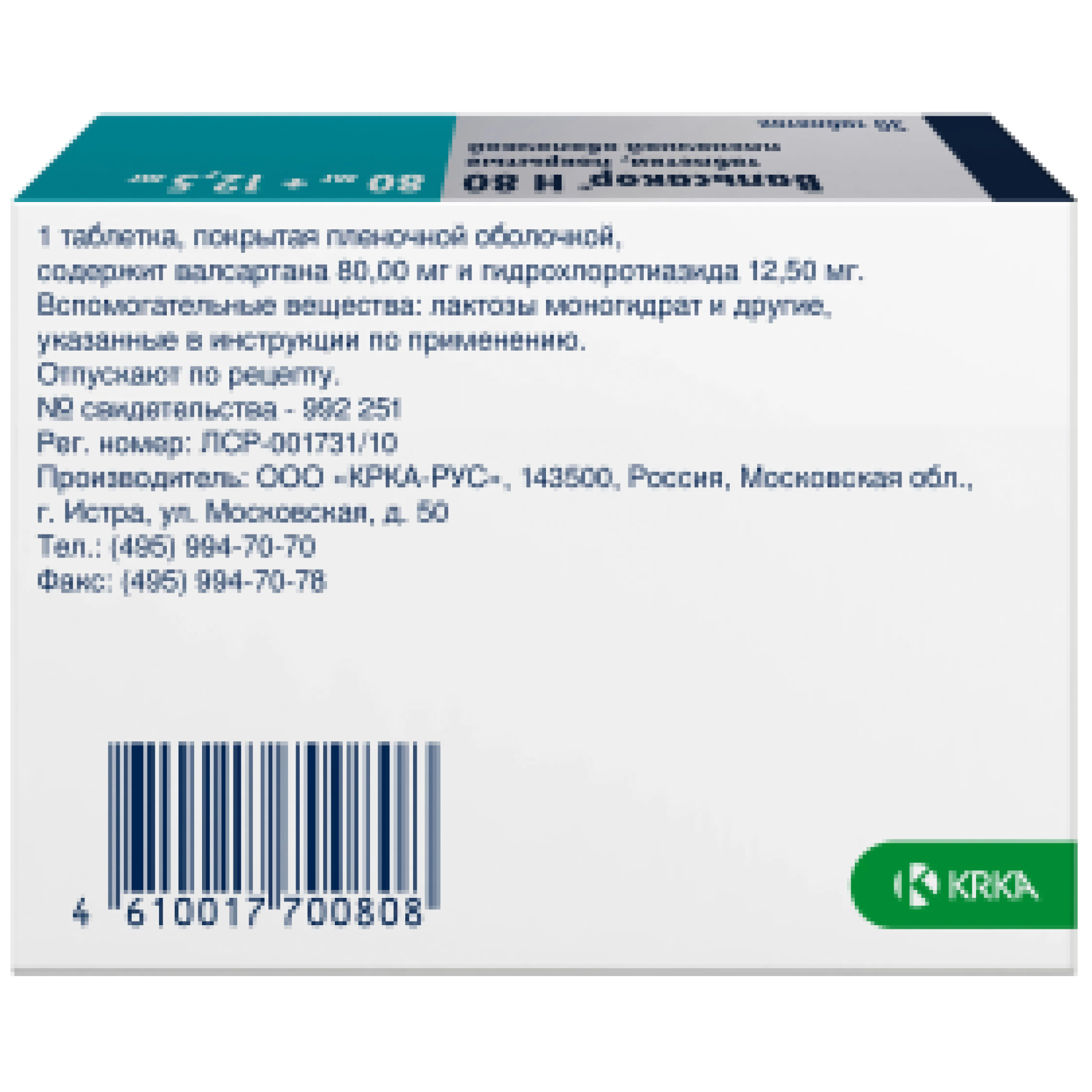 Вальсакор H 80 80 мг + 12,5 мг 30 шт таблетки покрытые пленочной оболочкой