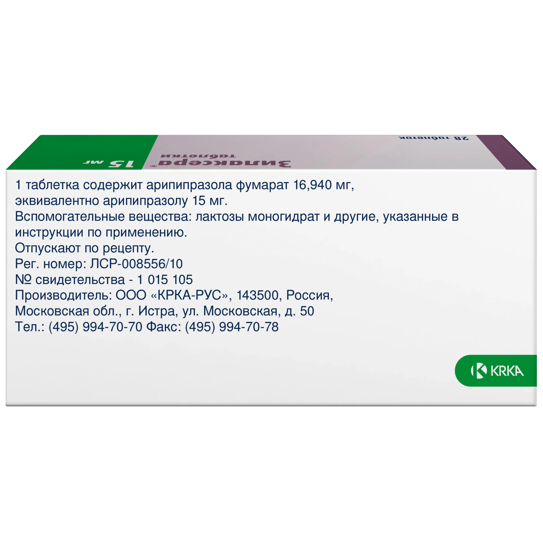 Одна таблетка 5 мг/10 мг/15 мг/30 мг содержит активное вещество арипипразола фумарат полуфабрикат-гранулы 74,25/148,50/222,75/445,50 мг, в том числе в виде арипипразола гемифумарата 5,647/11,293/16,940/33,880 мг, что соответствует арипипразолу 5/10/15/30 мг.